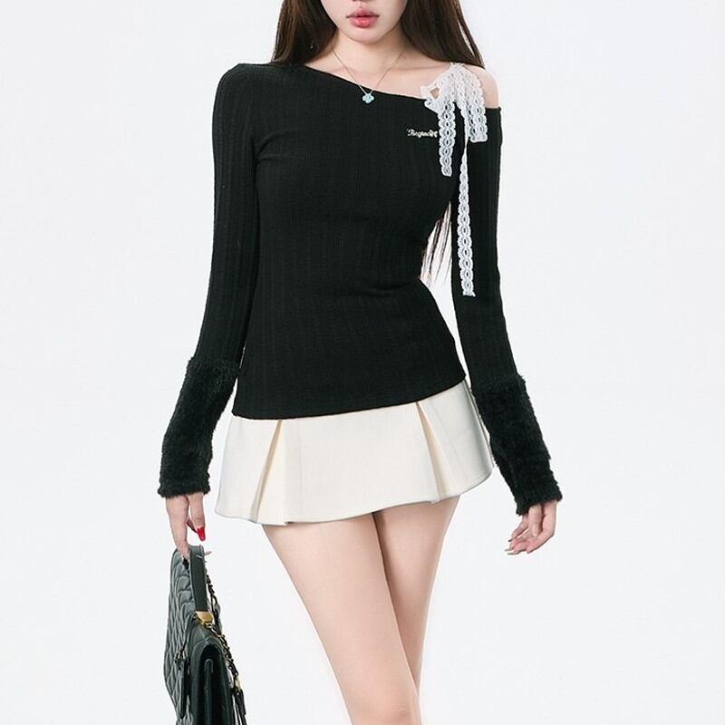 ワンショルダーデザインと繊細なレースリボンがフェミニンなニットトップスです。