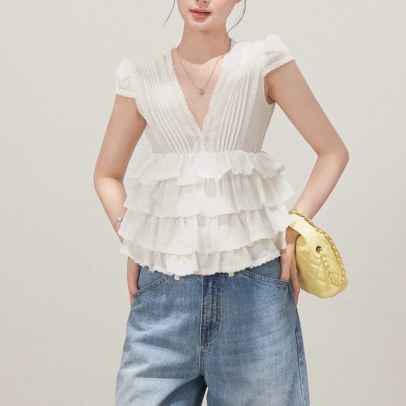 繊細なプリーツとティアードデザインが軽やかで華やかな印象。