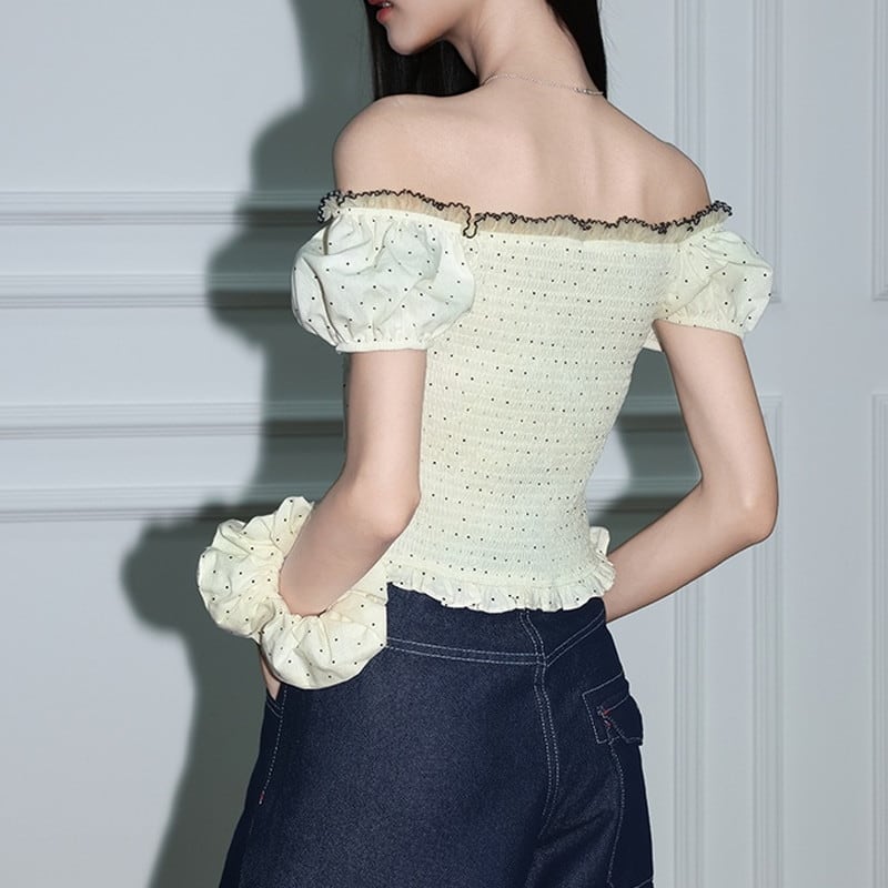dot lace pleats ribbon puff-sleeve blouse m0796
