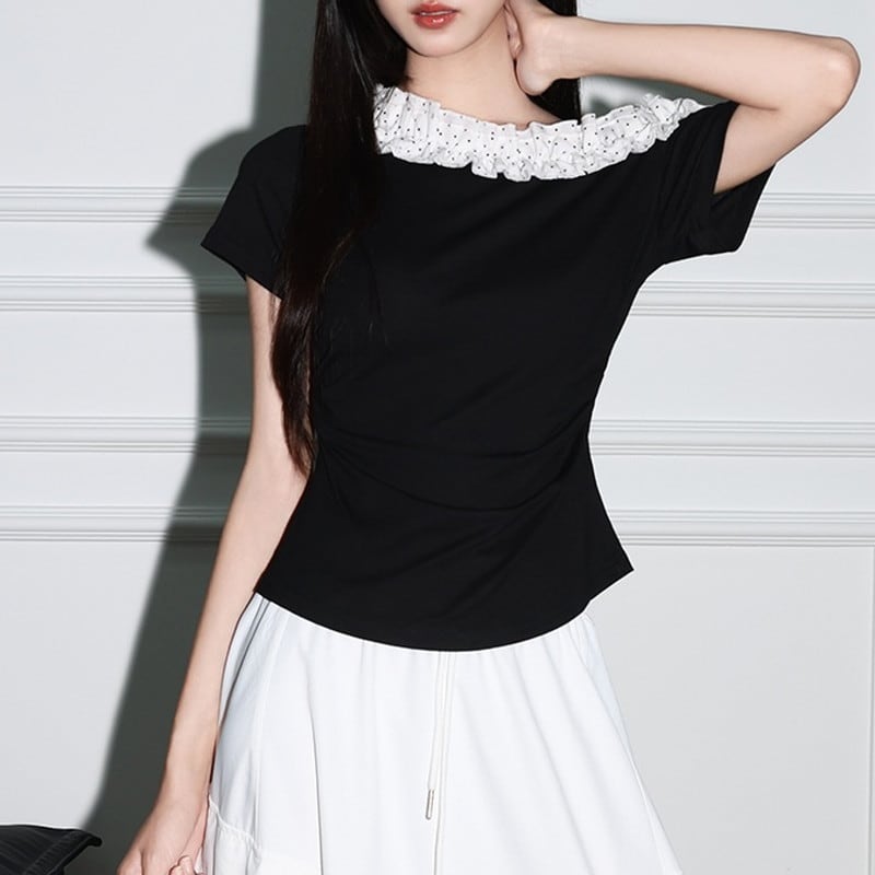 ワンショルダーデザインとドット柄フリルがポイントのトップスです。