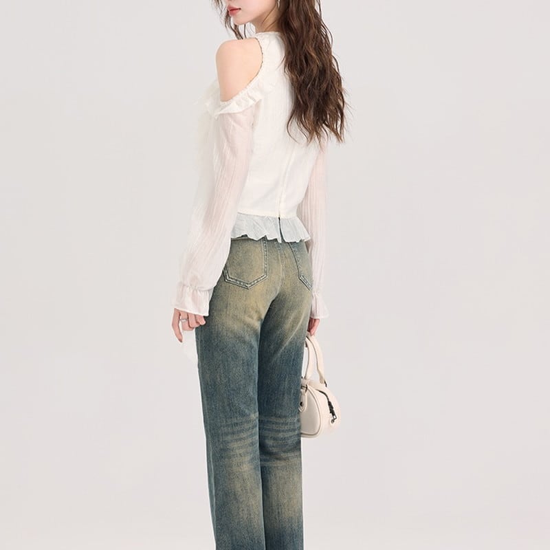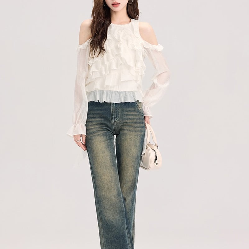 肩出しデザインと繊細なフリルがフェミニンな印象を与えるブラウスです。
