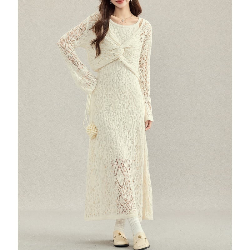繊細なレース編みが印象的なワンピースとカーディガンのセットです。