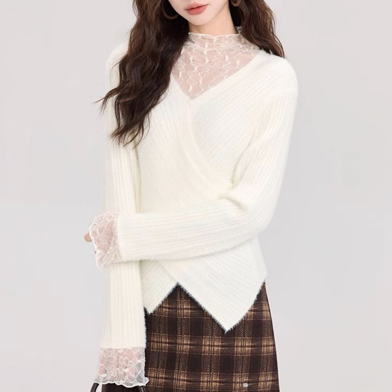 レースを重ねたような襟元と袖口のディテールが、上品で華やかなアクセントをプラスします。