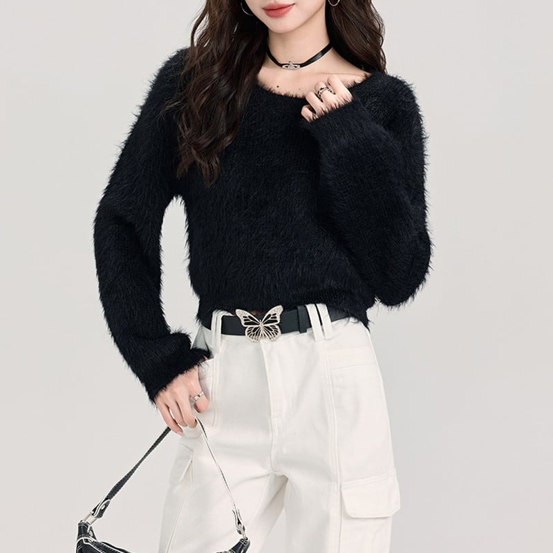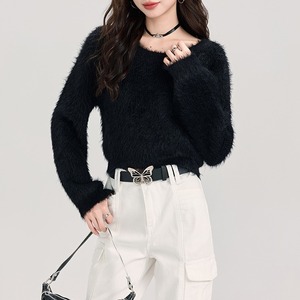 ふんわりとしたモヘアタッチの素材が女性らしい印象を与えるニットです。