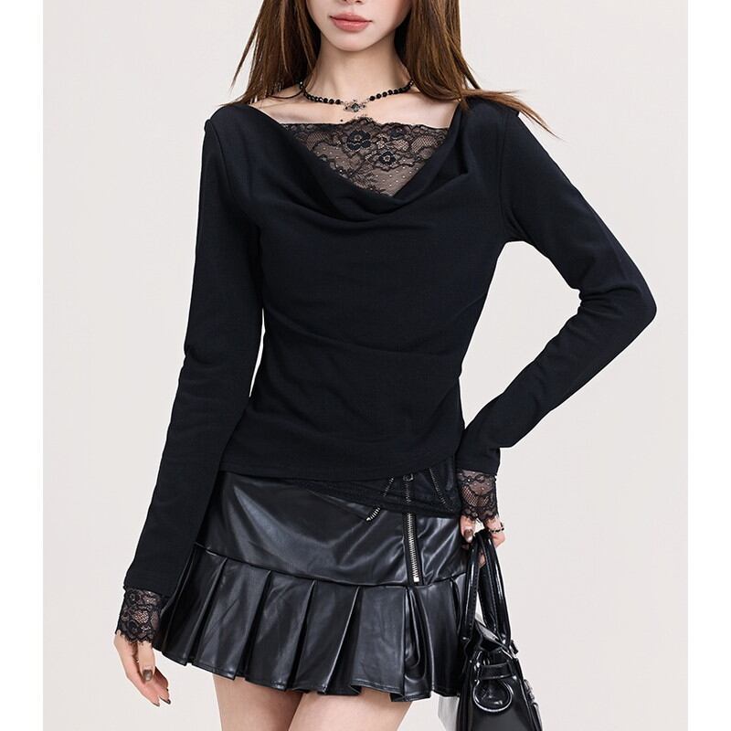 ドレープネックとレースの組み合わせが魅力のニットブラウスです。