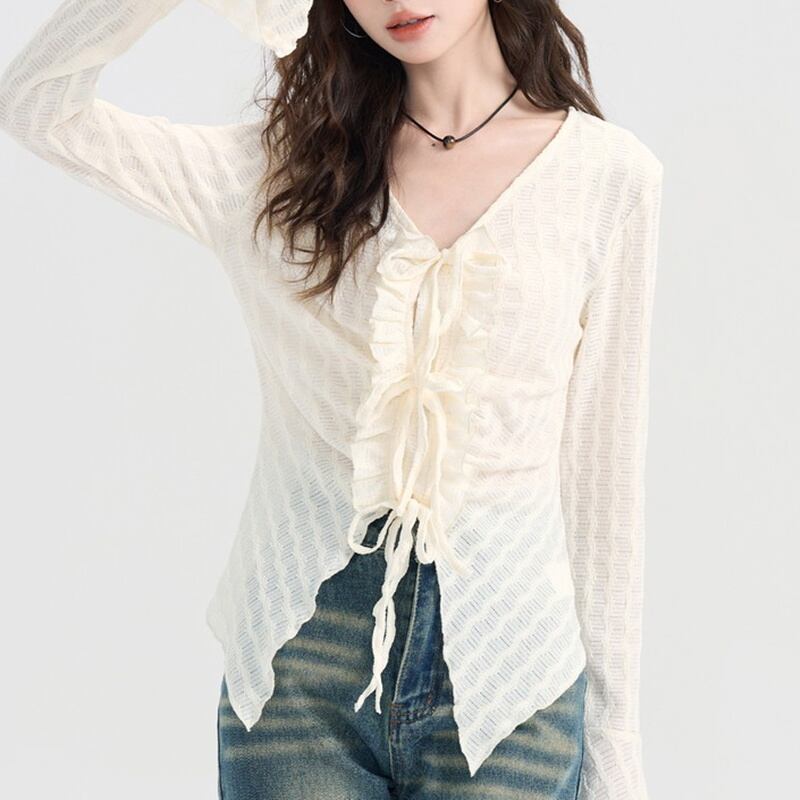 フロントのリボンデザインがフェミニンな印象を与えるシアーブラウスです。