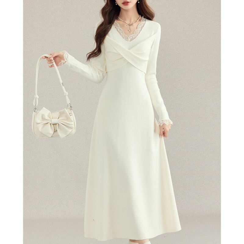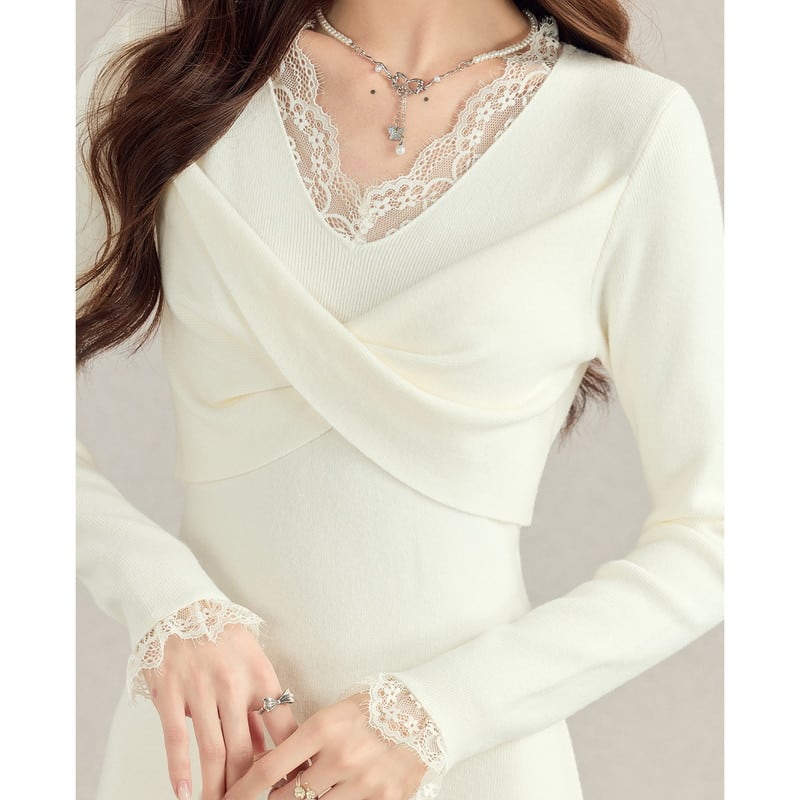 胸元に施された繊細なレースが上品なアクセントとなり、顔まわりを華やかに演出。
