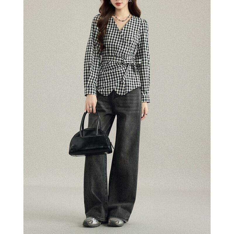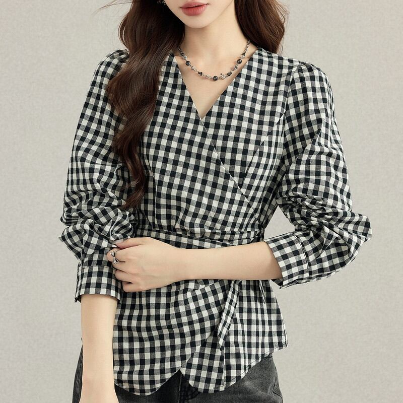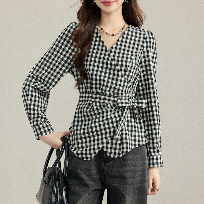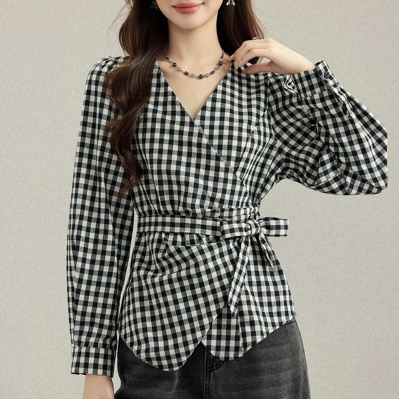 上品なギンガムチェック柄が目を引く、ラップ風デザインのブラウスです。