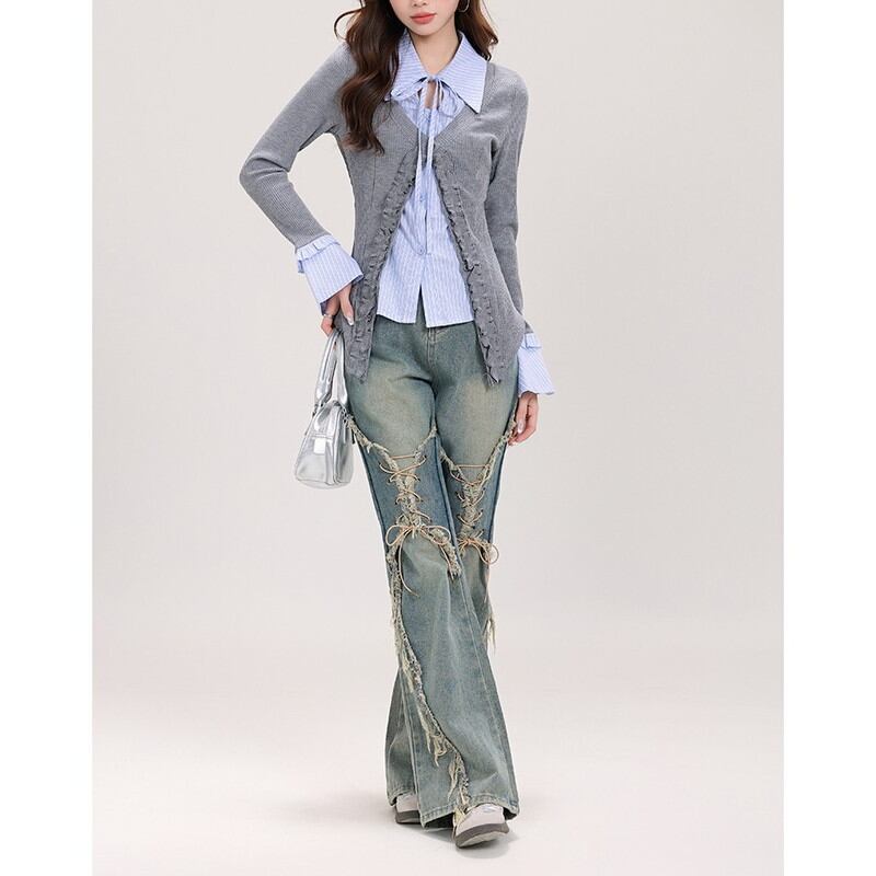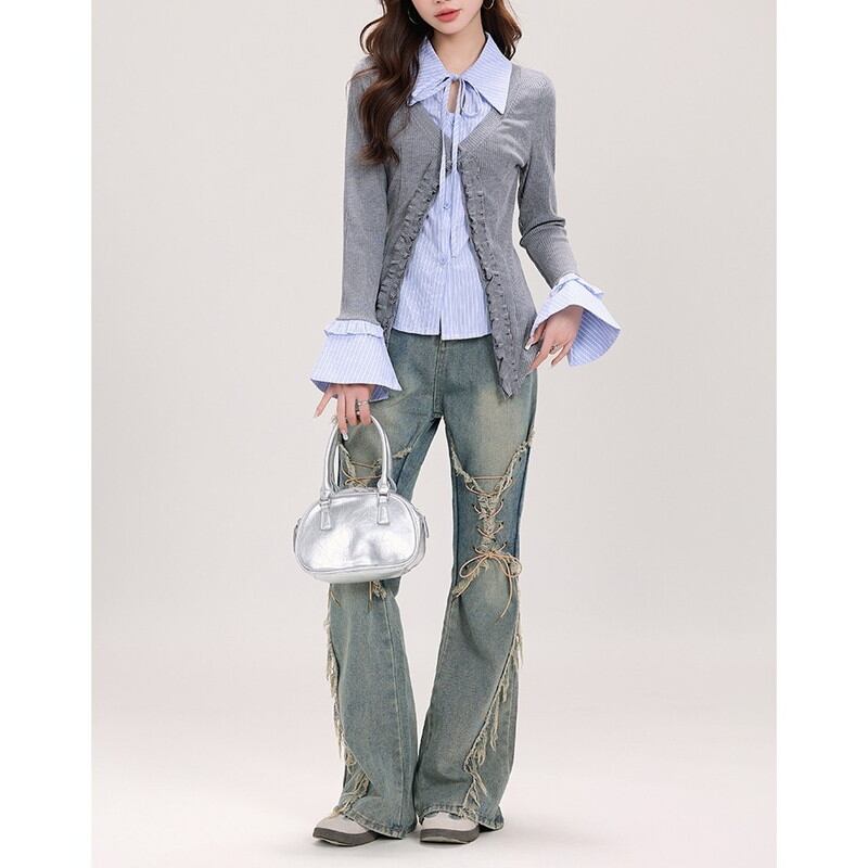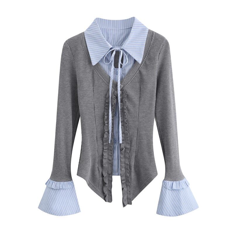 ストライプ柄のシャツ襟と袖口のフリルが上品で、フェミニンな印象をプラス。