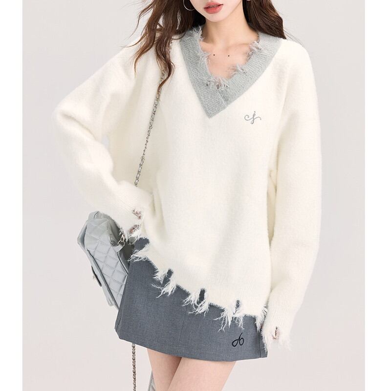 ゆったりとしたシルエットでリラックス感がありつつ、首元と裾の切り替え配色がスタイリングを引き締めます。