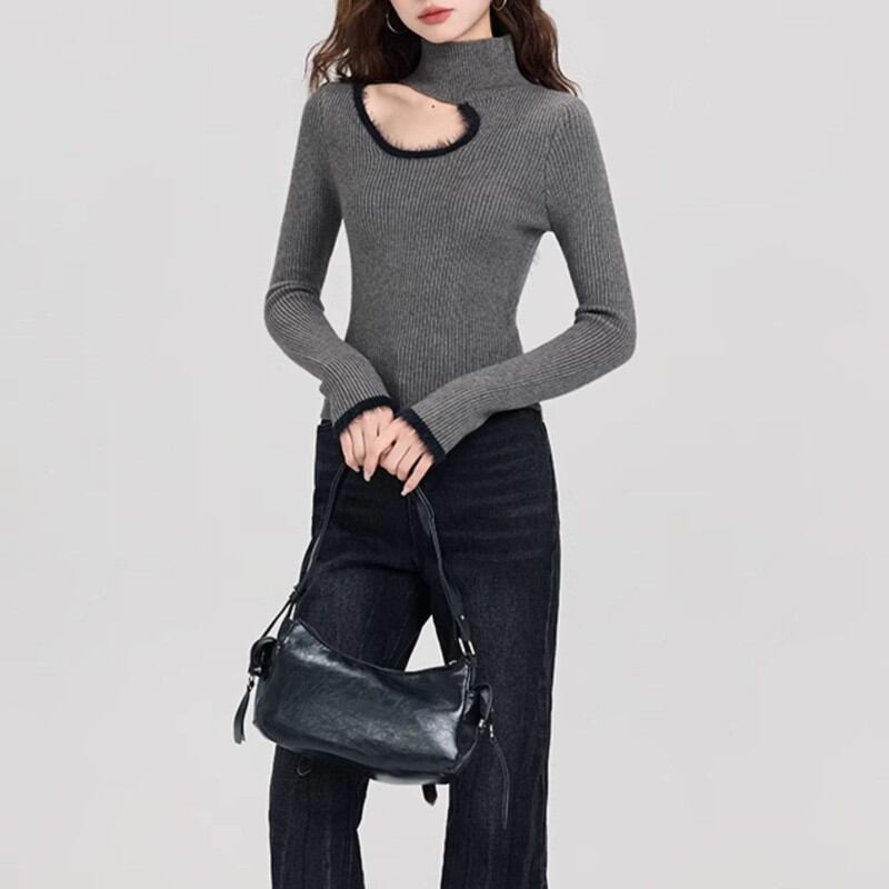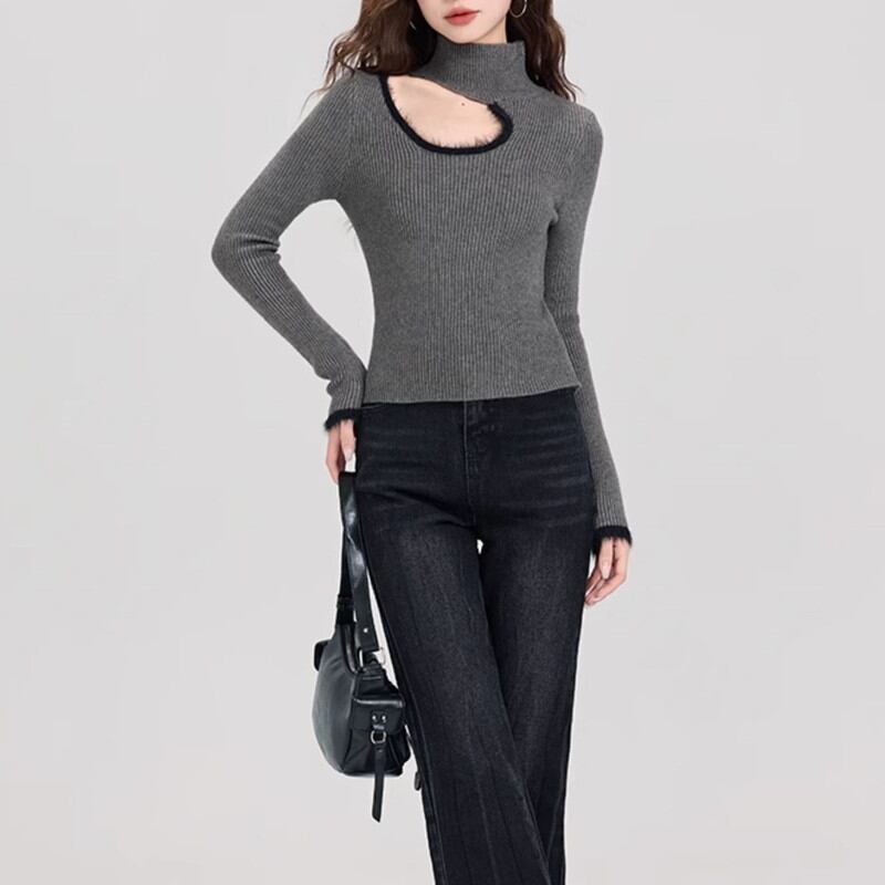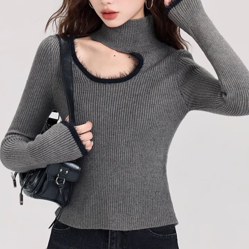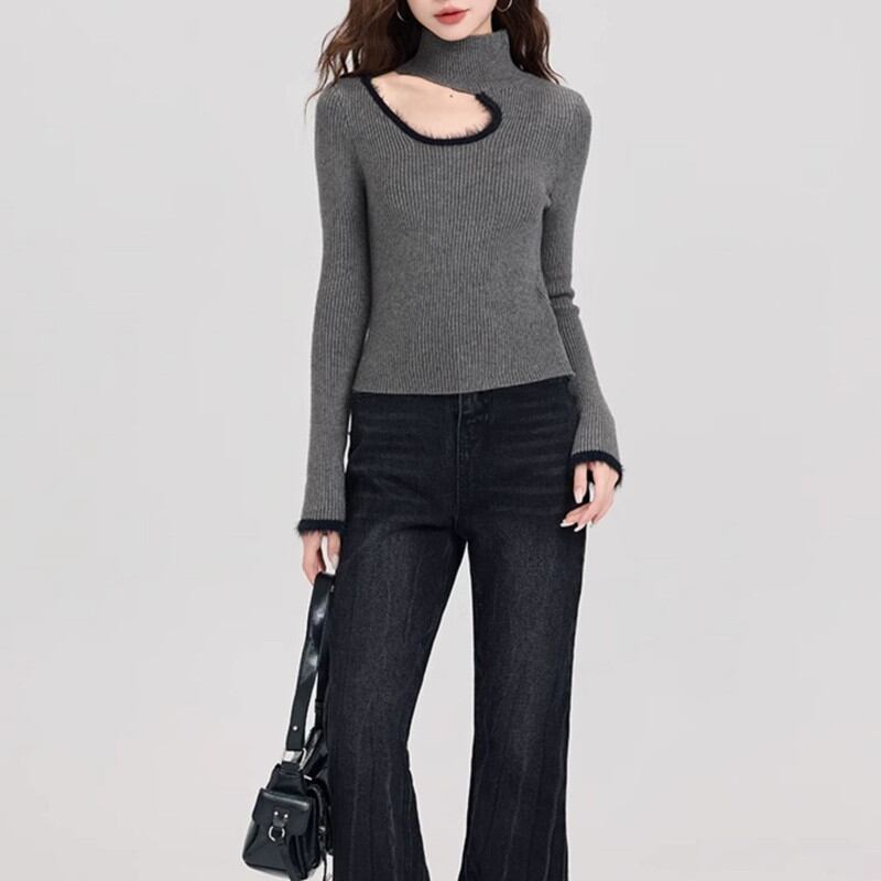 首元のカットアウトデザインが目を引くモックネックニットです。