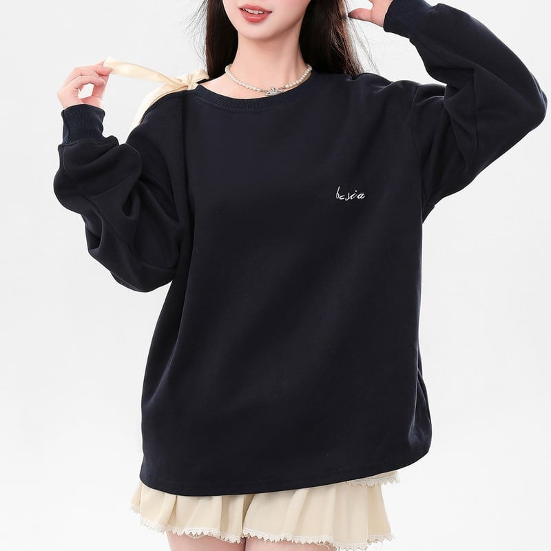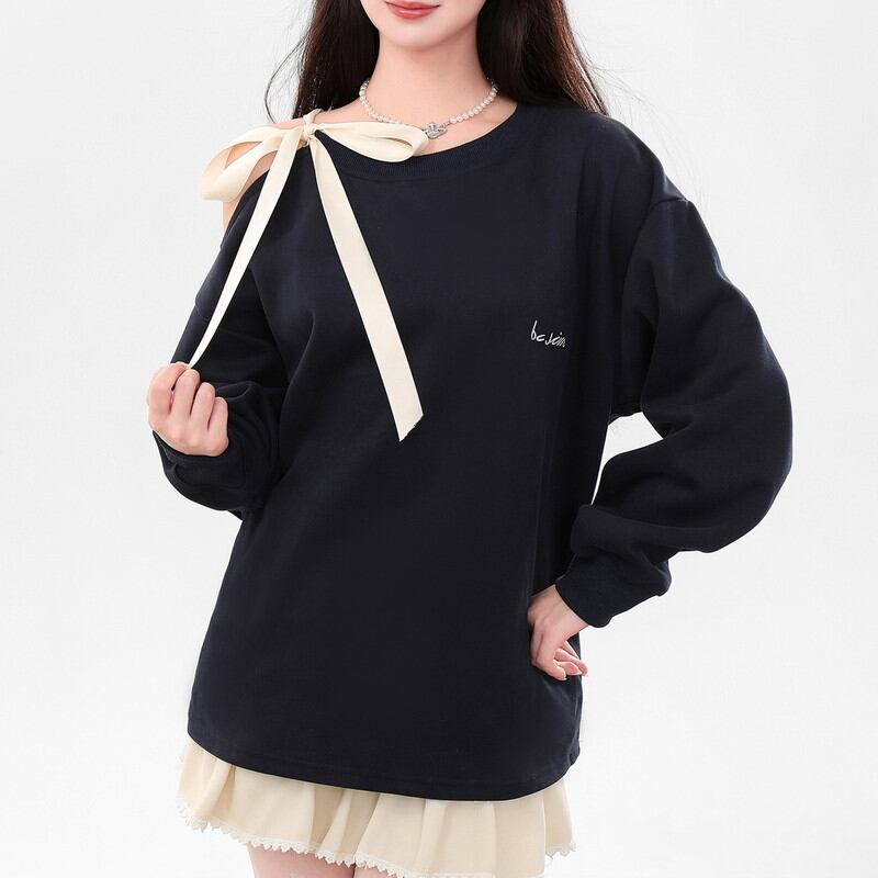 肩にあしらった大きなリボンが目を引く、ガーリーなデザインのプルオーバーです。