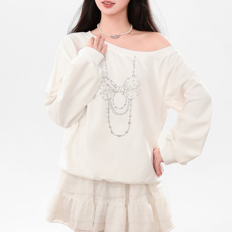 胸元のリボンチェーンプリントが印象的な、フェミニンムード漂うプルオーバーです。