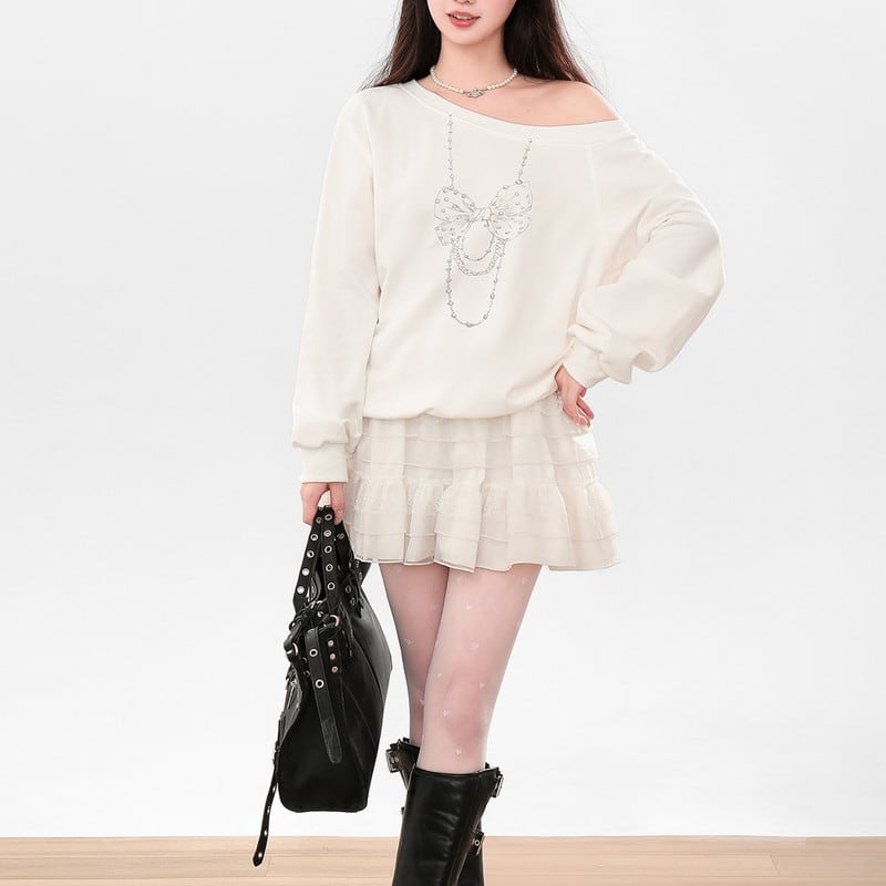 片方の肩を軽く落として着られるオフショルデザインで、ゆるっとしたシルエットが抜け感と女性らしさを演出。