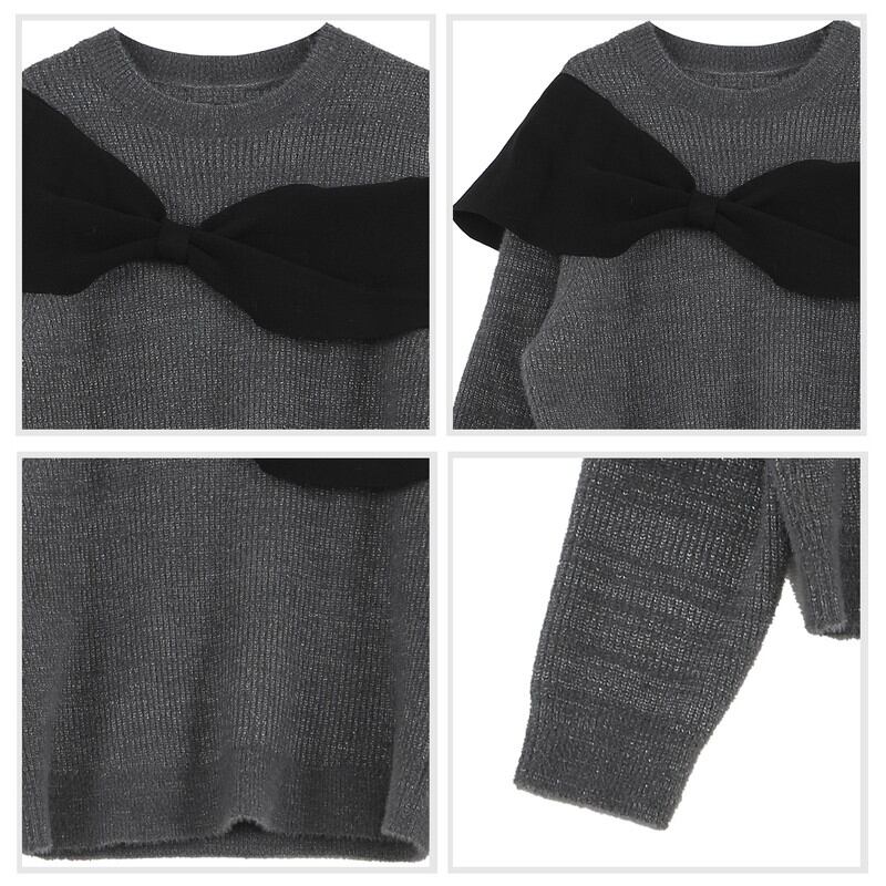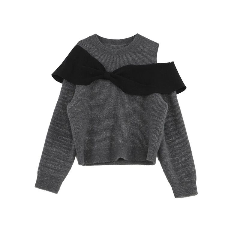 大きなリボンが目を引く、フェミニンな印象のオープンショルダーニットです。