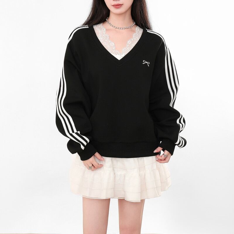 肩から袖にかけて施されたラインデザインがスポーティーなアクセントになるVネックスウェットです。