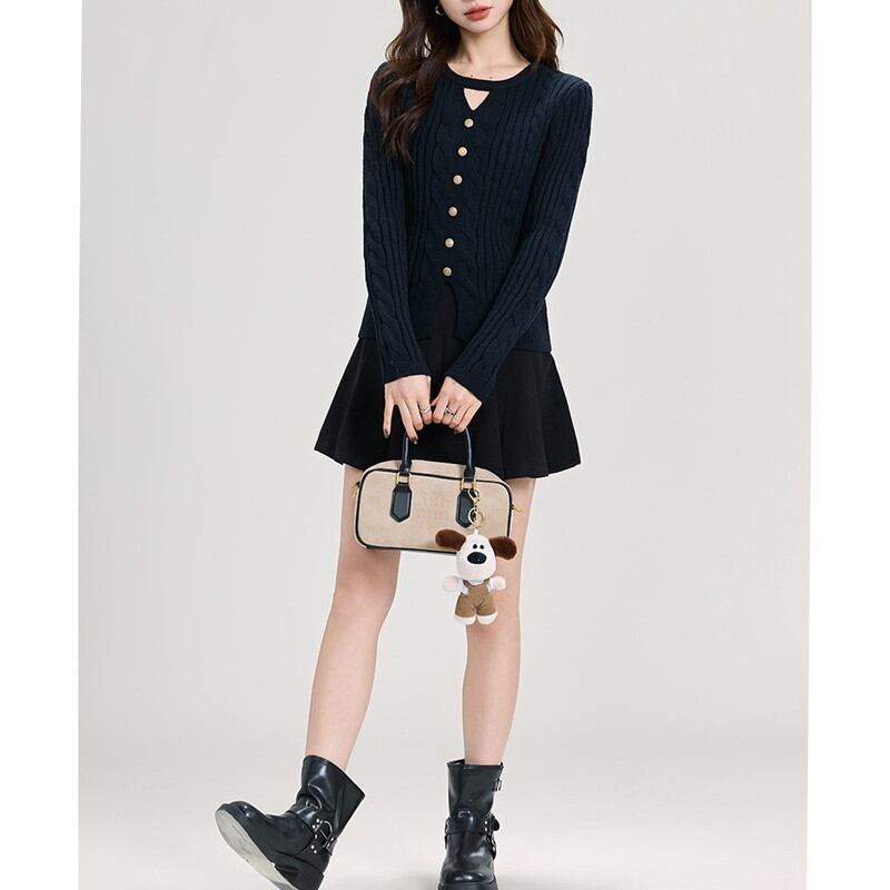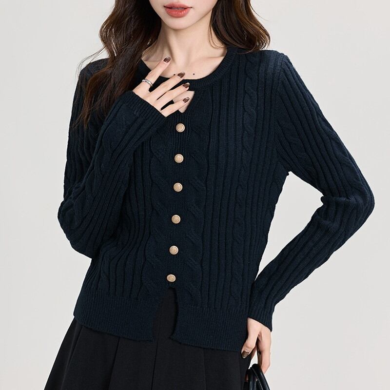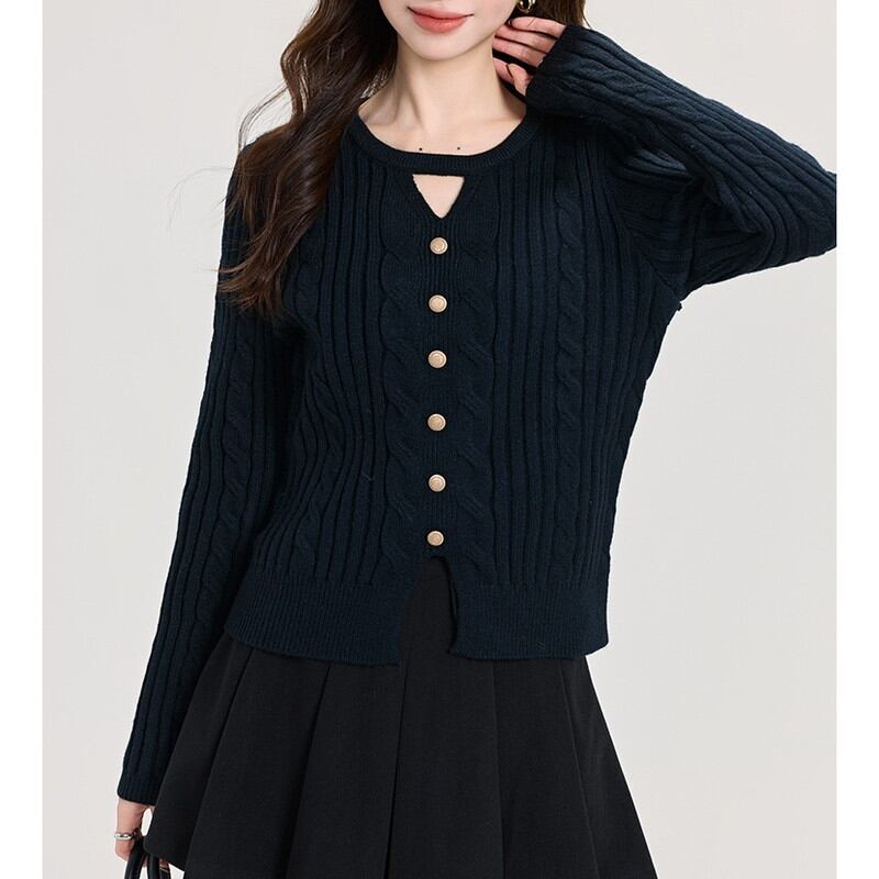 フロントのボタンデザインと上品なケーブル編みが目を惹くニットトップスです。