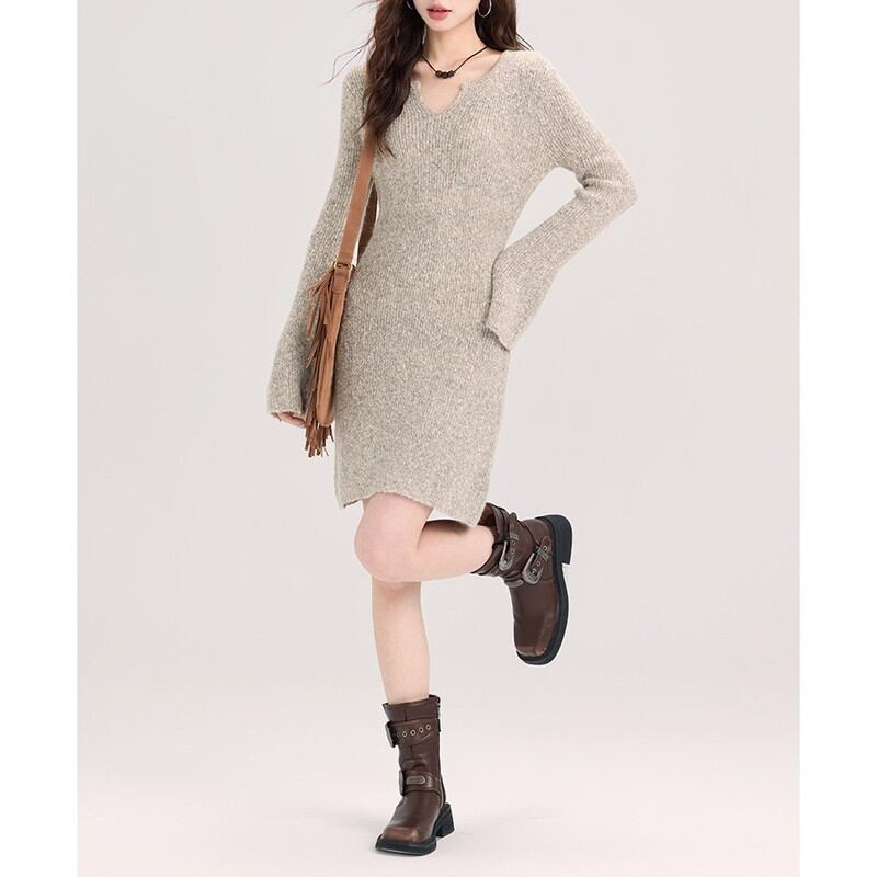ナチュラルな雰囲気と女性らしさを両立した、Vネックニットワンピースです。