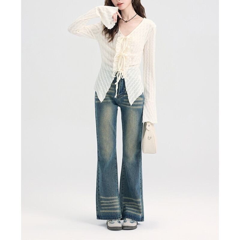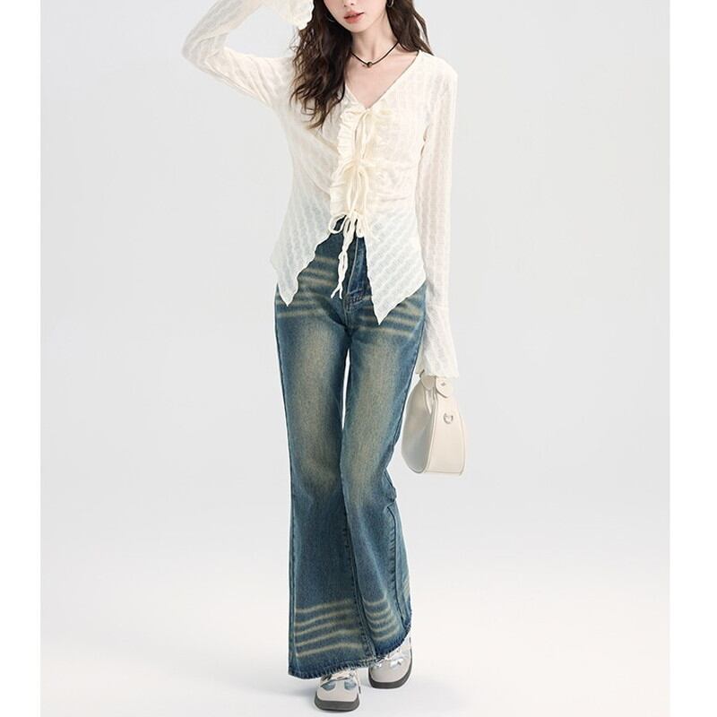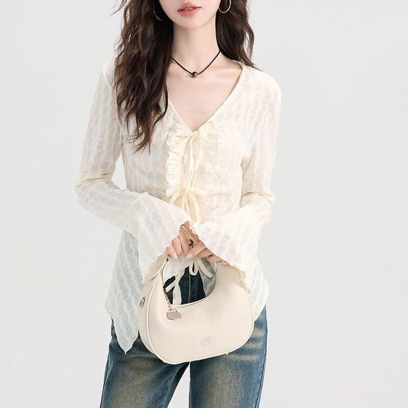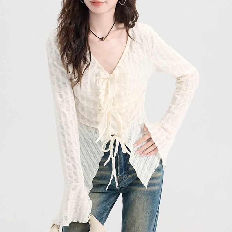フロントのフリルとリボンデザインが華やかな印象を与えるシアーブラウスです。