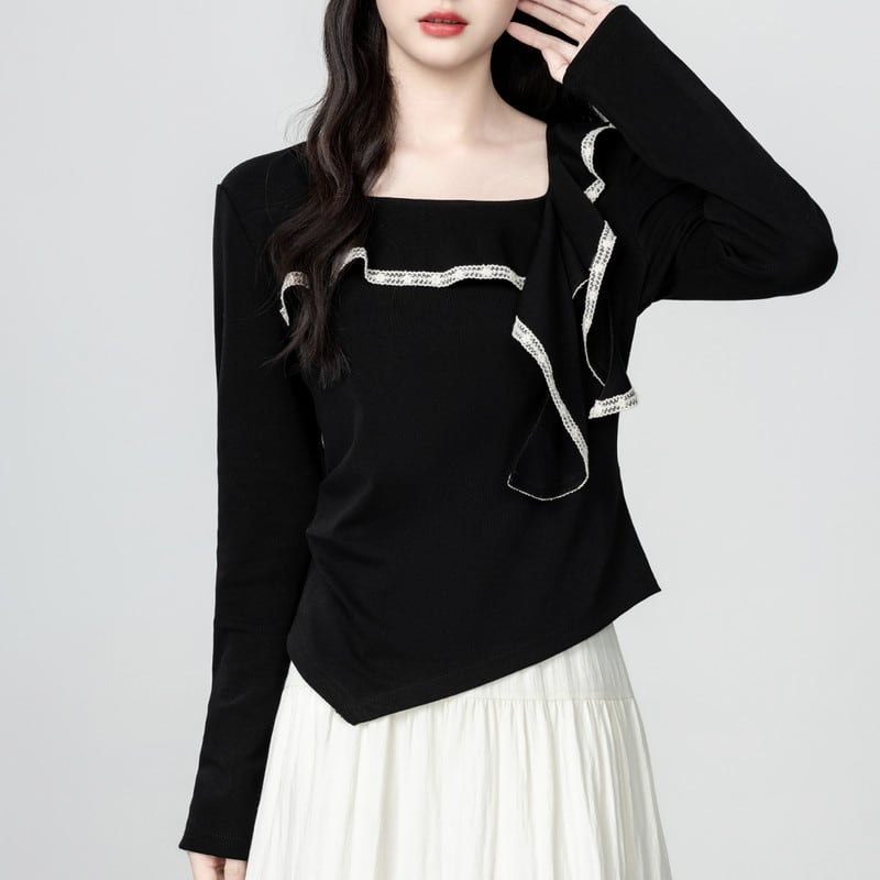 フロントにあしらわれた繊細なレースフリルが上品なアクセントとなり、フェミニンな雰囲気を演出。