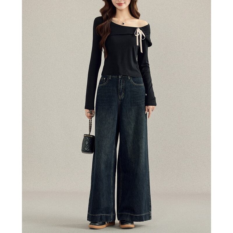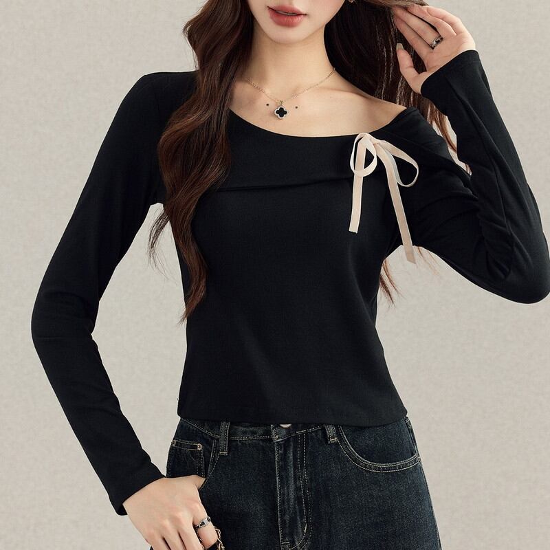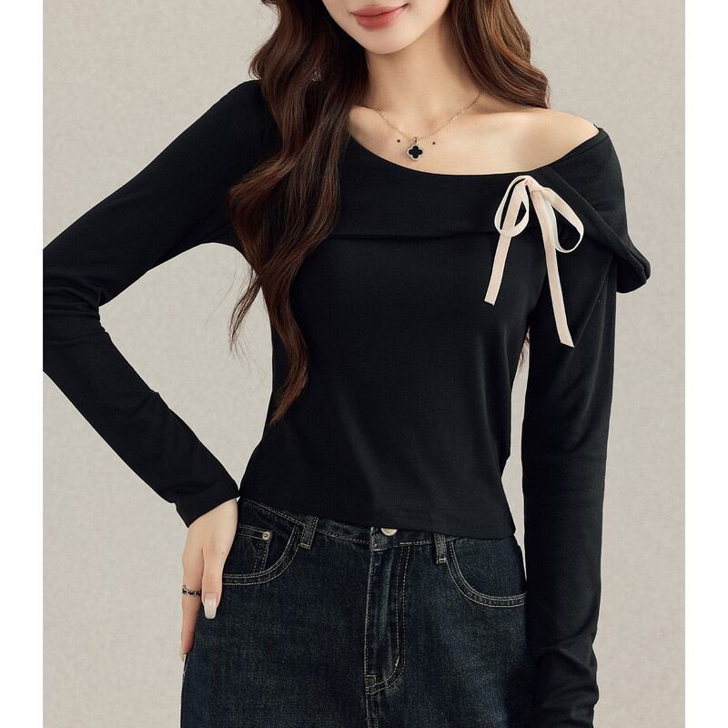 ネックラインに添えられたリボンがフェミニンなアクセントとなり、シンプルながらも印象的なスタイルに。