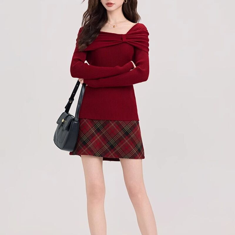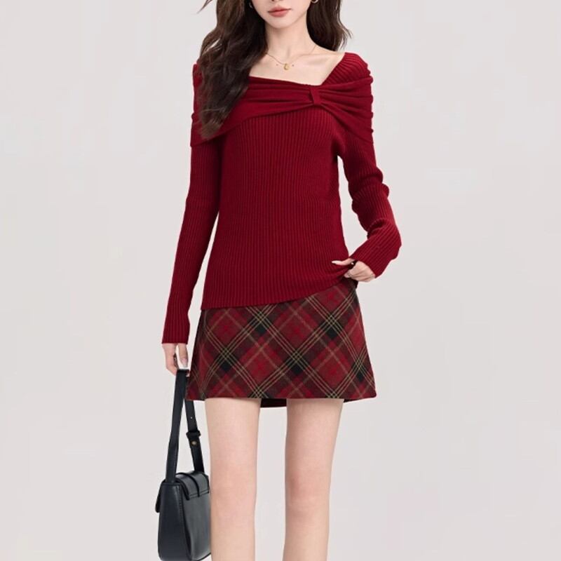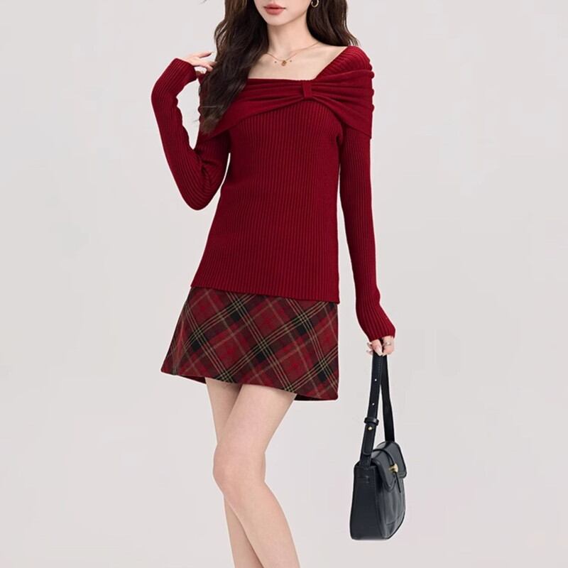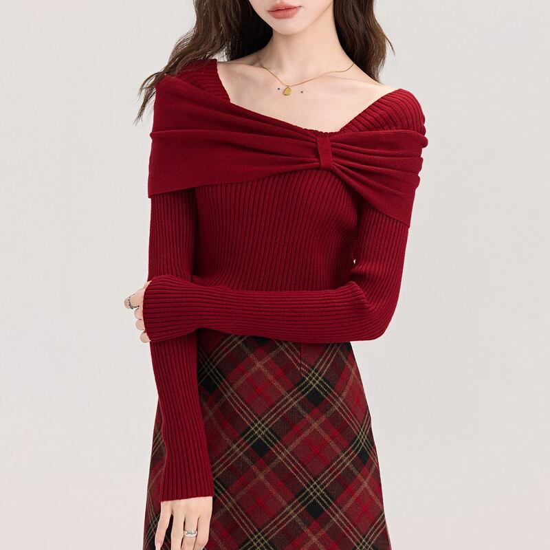 スクエアネック×オフショルダーのデザインがデコルテラインを美しく引き立てるニットです。