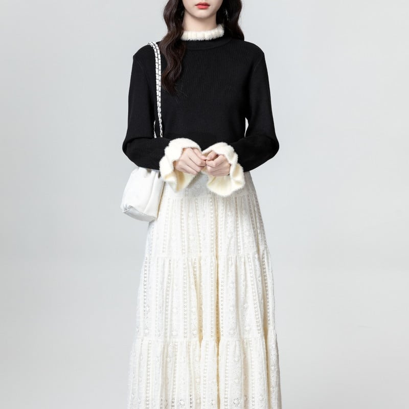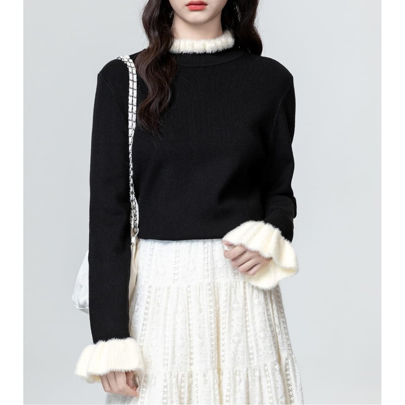 襟元と袖口のアクセントが品よく映えるフェイクファーアクセントニットトップスです。