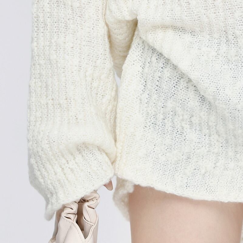 肩まわりの透かし編みがやわらかな抜け感を添えるニットチュニックです。