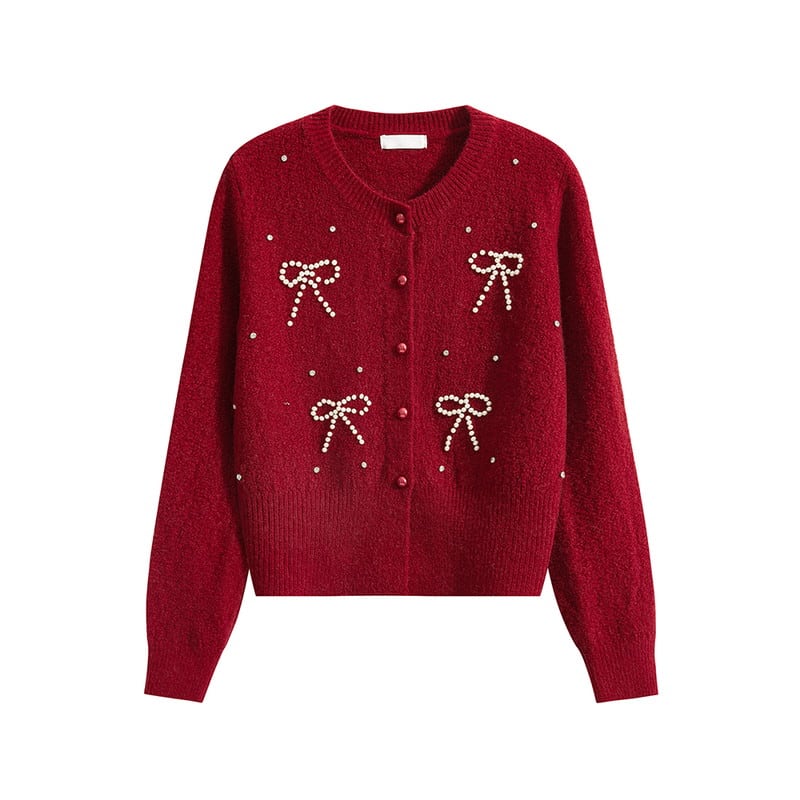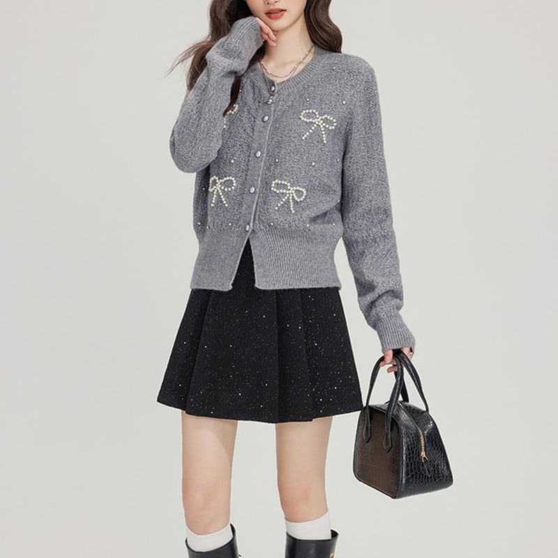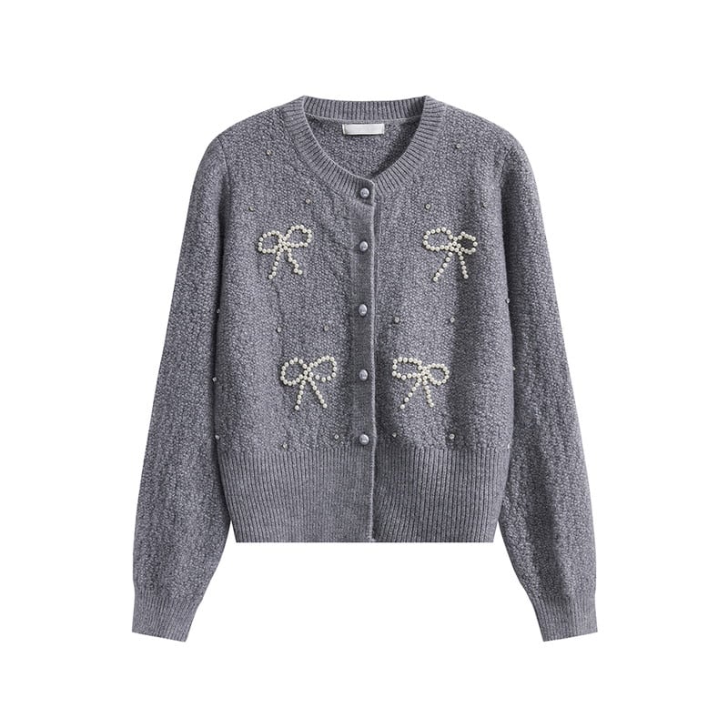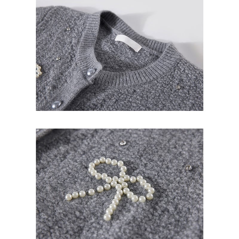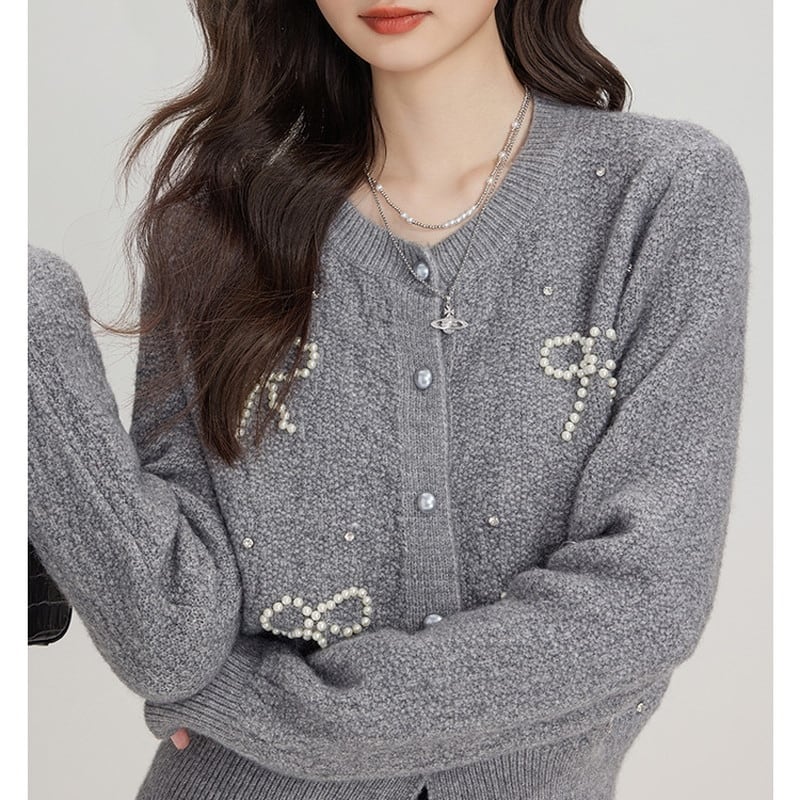 パールで描かれたリボンモチーフが華やかな印象のニットカーディガンです。