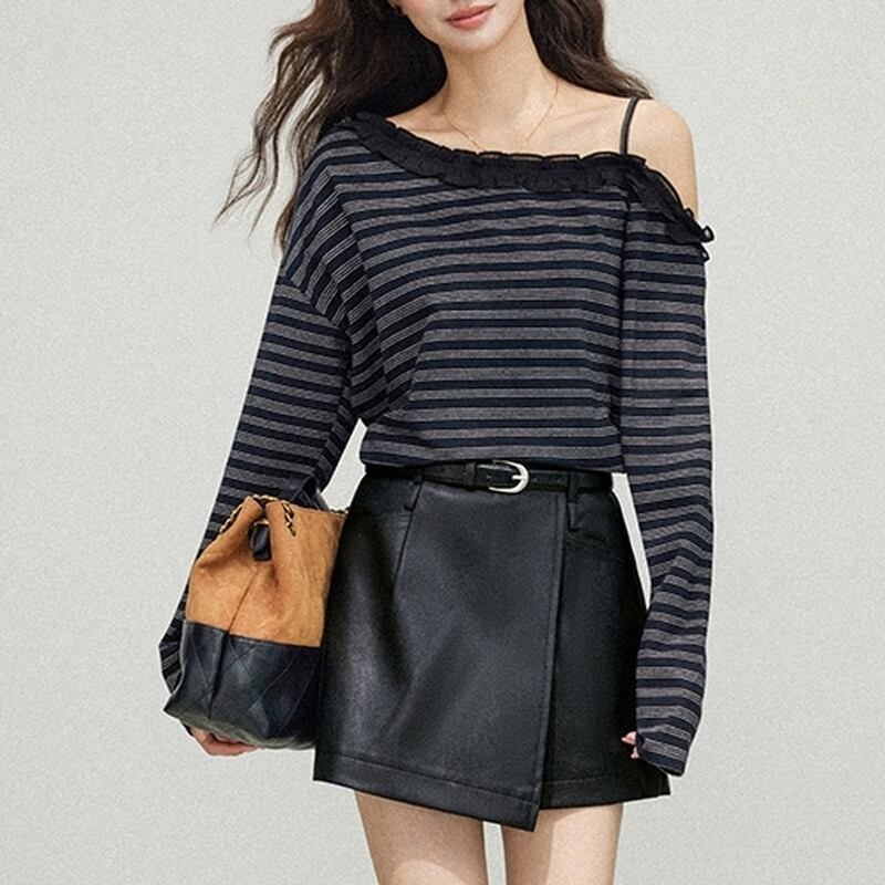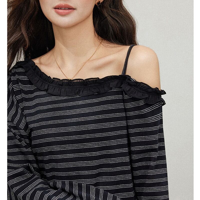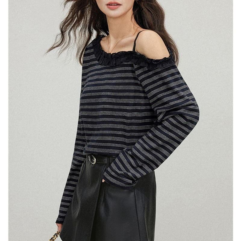 肩にかかるフリルがさりげない甘さを添えるボーダー柄オフショルダートップスです。