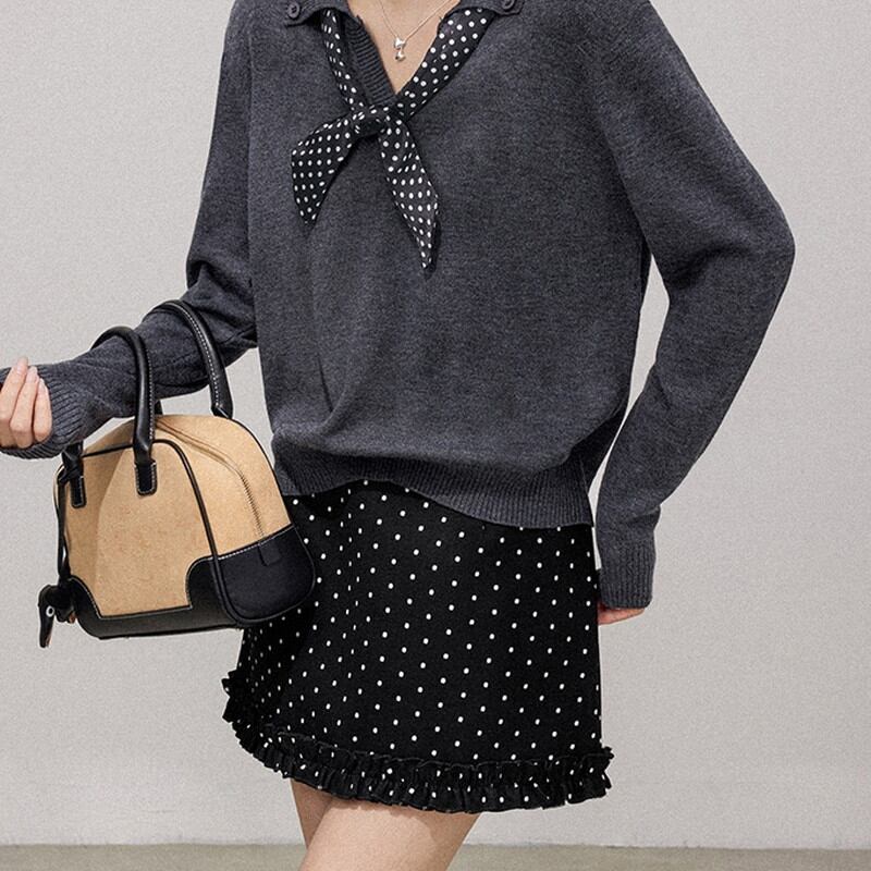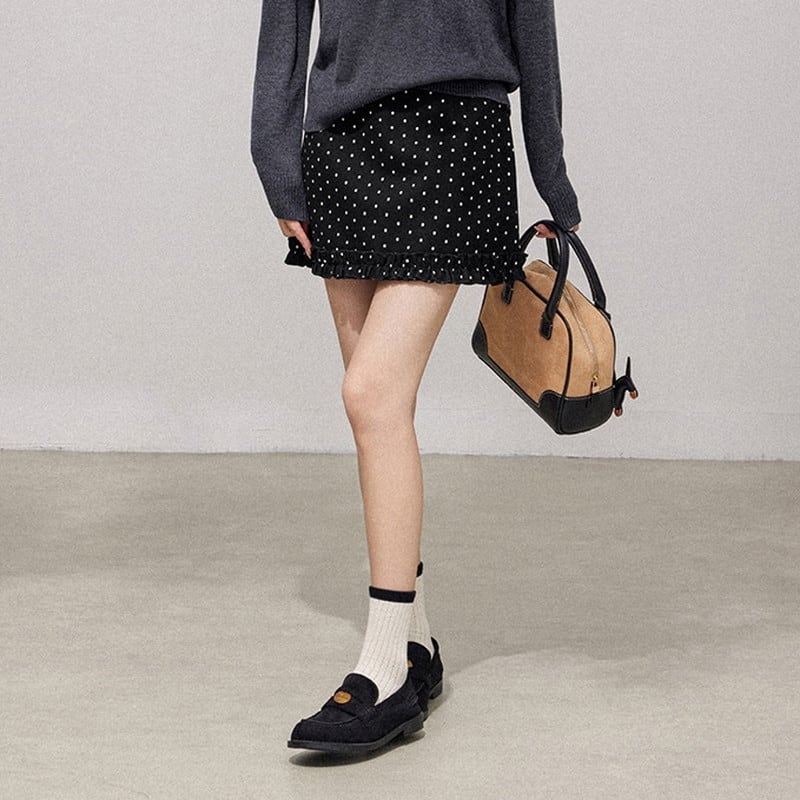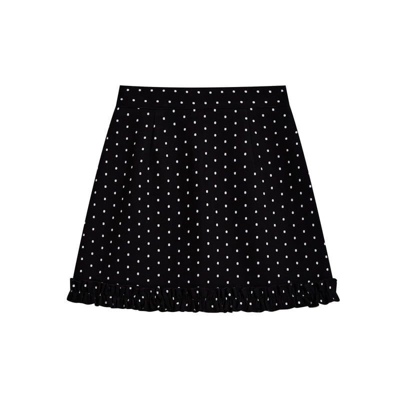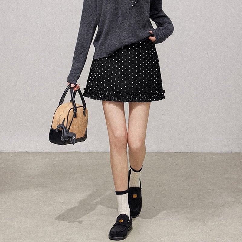 裾のフリルデザインが動きに合わせて揺れ、フェミニンな印象をプラス。
