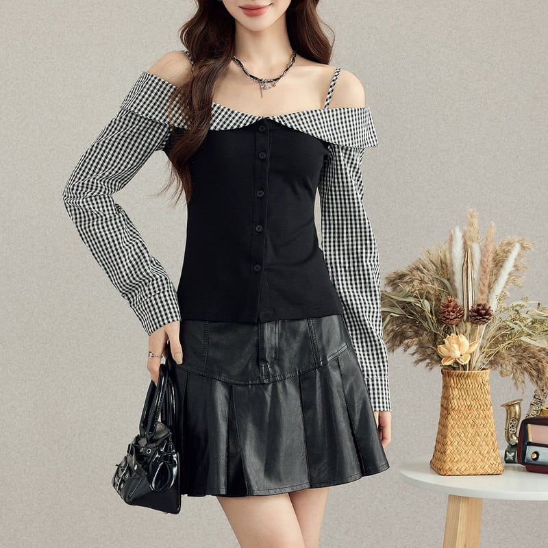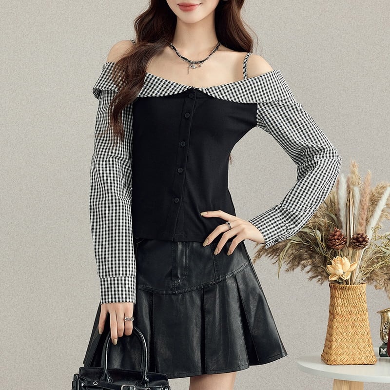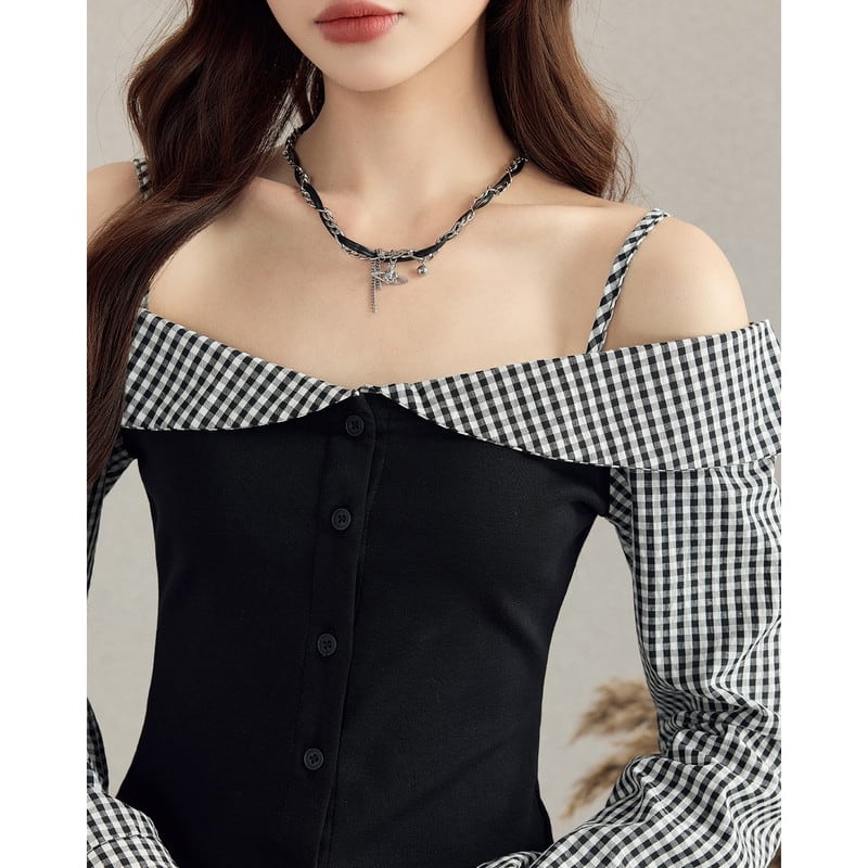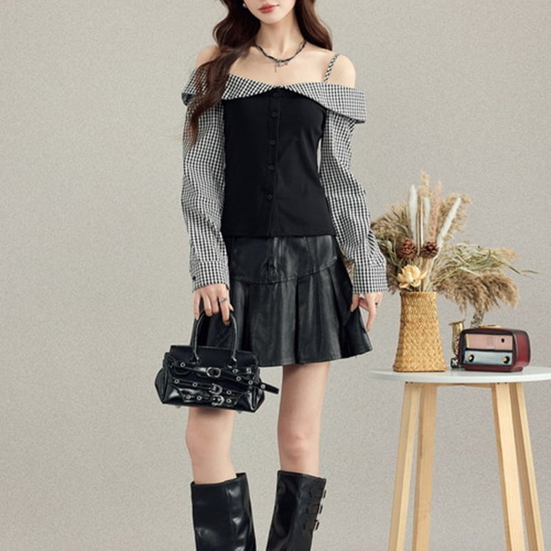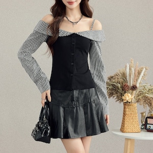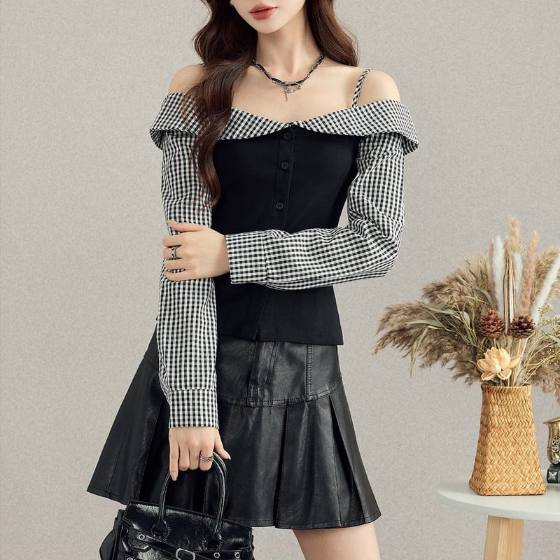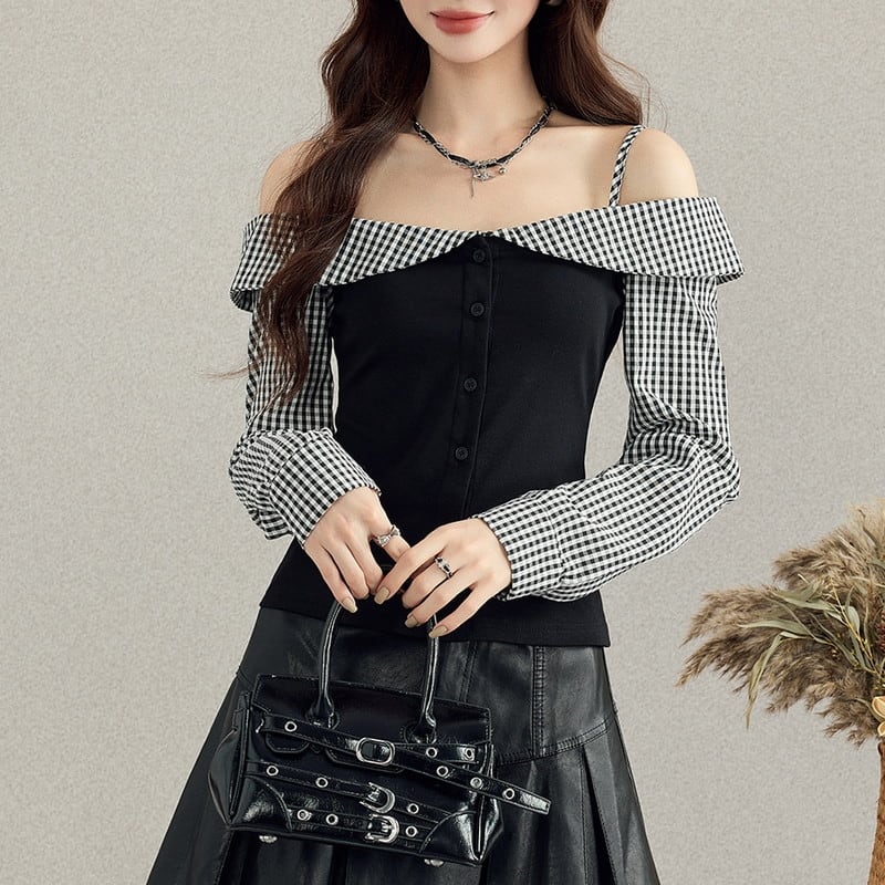 ギンガムチェックを組み合わせたデザインが目を惹くオフショルダートップスです。