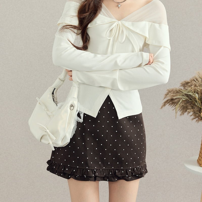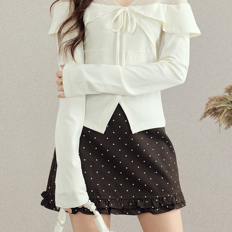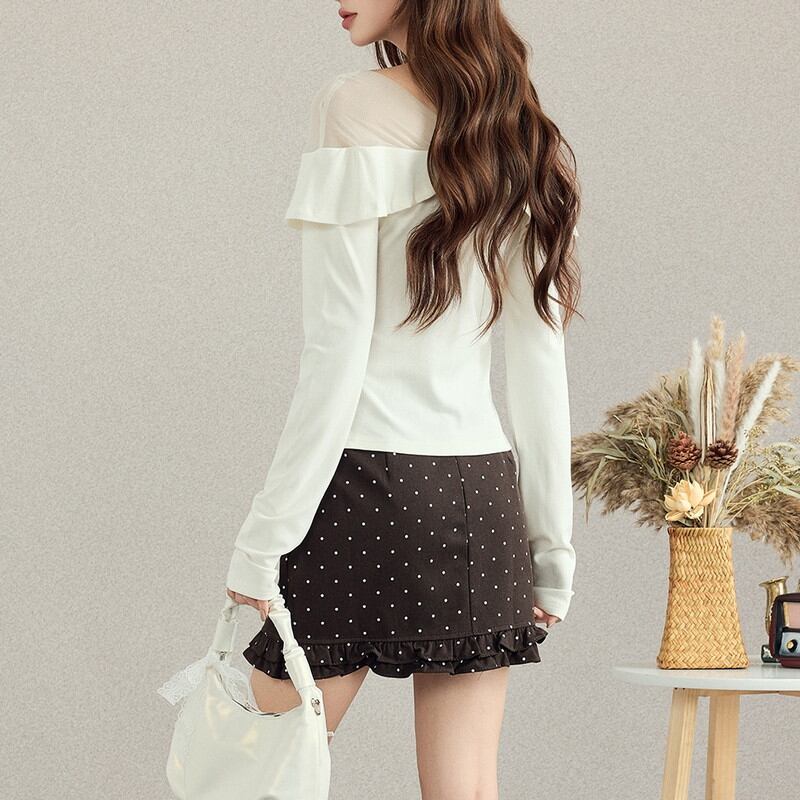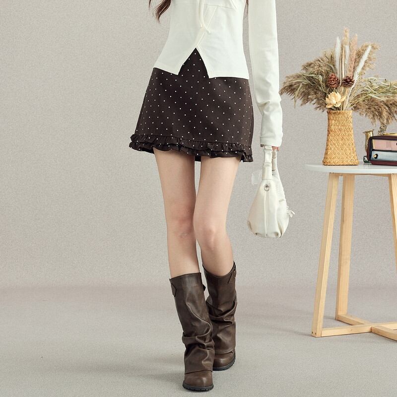 細かなドット柄に裾のフリルを添えた、愛らしい印象のミニスカートです。