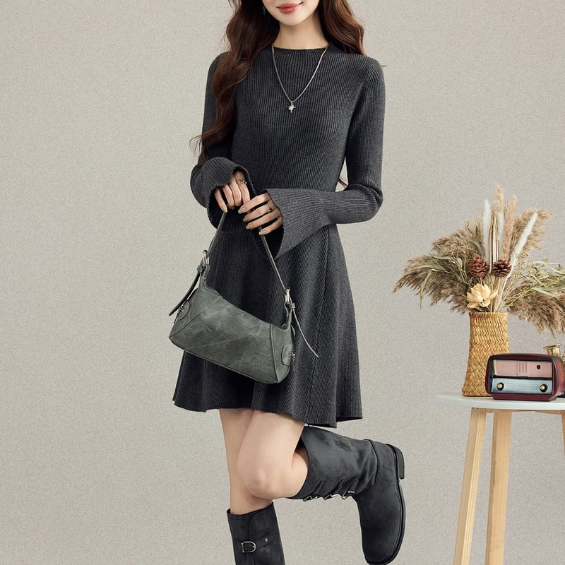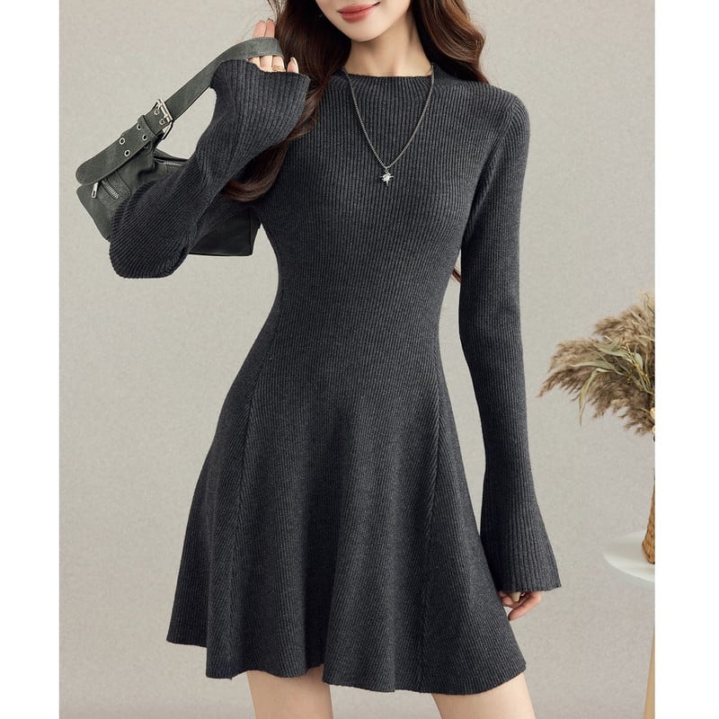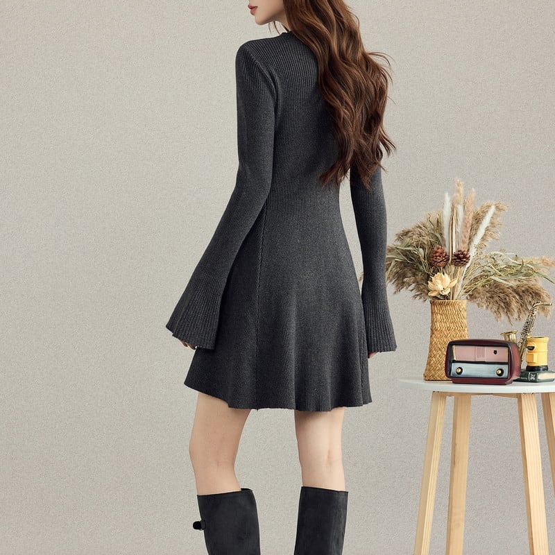 すっきりとしたリブ編みが縦ラインを強調するフィットフレアシルエットのニットワンピースです。