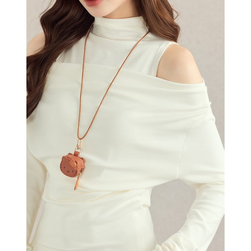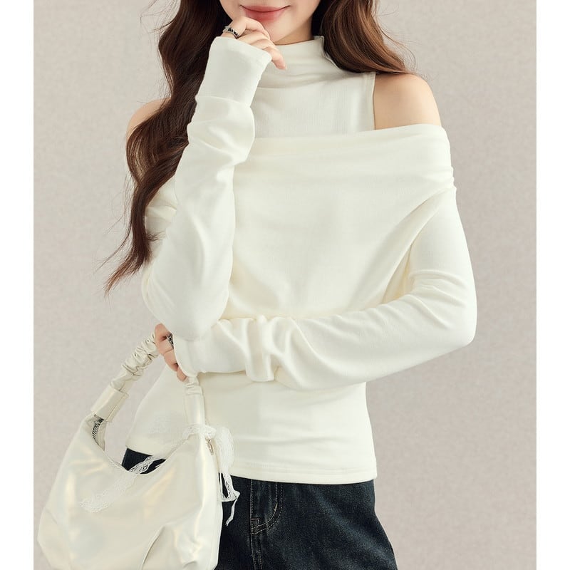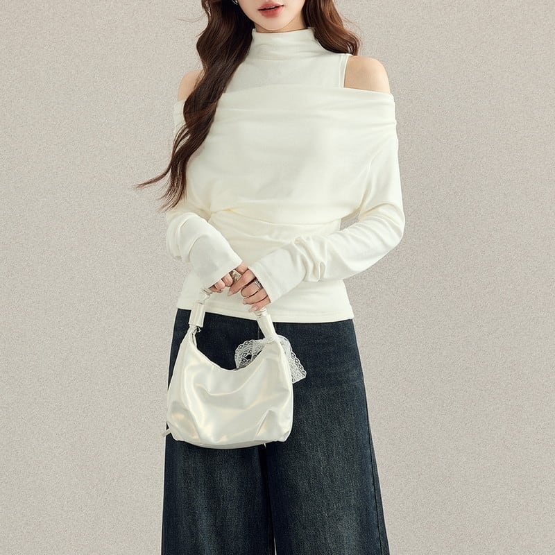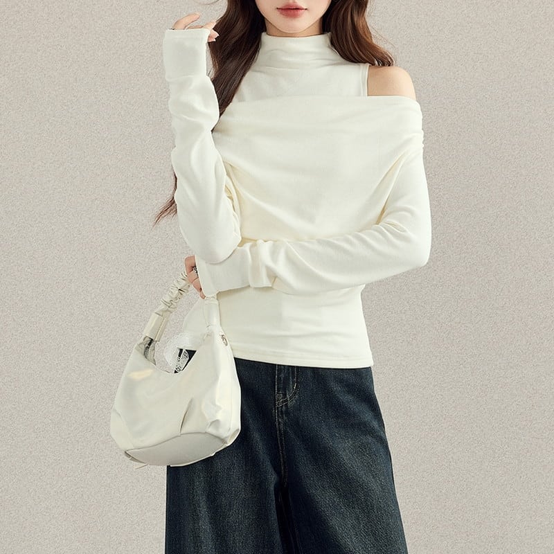 アシンメトリーに肩を見せるデザインが、さりげない抜け感を添えるトップスです。