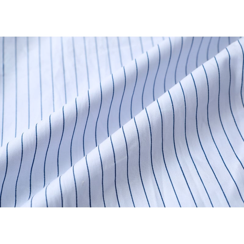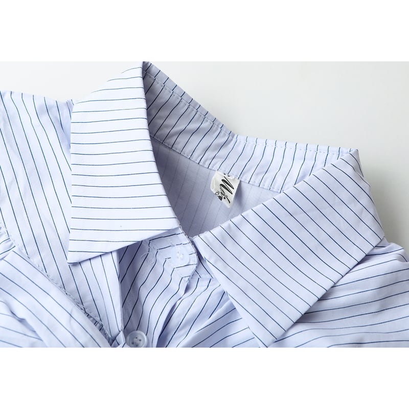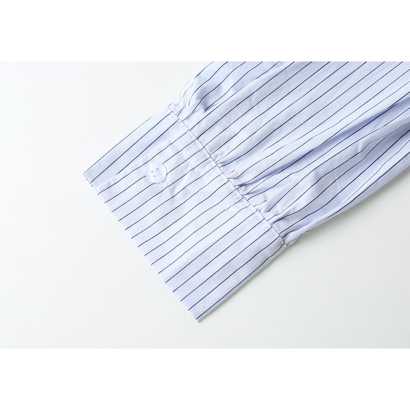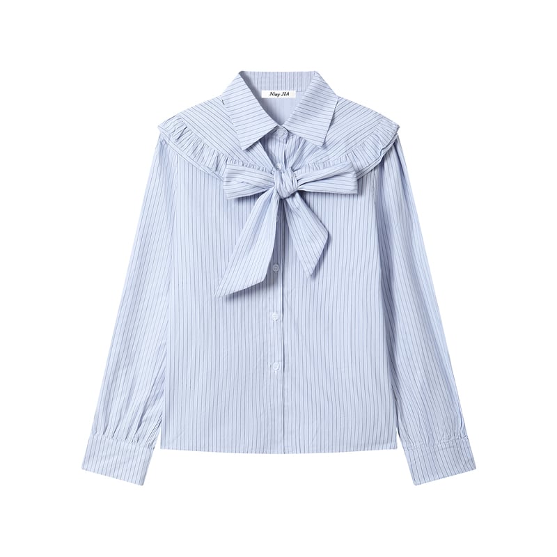 縦のラインが際立つストライプ柄のシャツは、すっきりとした印象を与えます。長袖なので、一枚で着ても、ジャケットやカーディガンと合わせてもおしゃれに着こなせます。ボウタイは結び方によって印象を変えられるので、様々なアレンジを楽しめます。