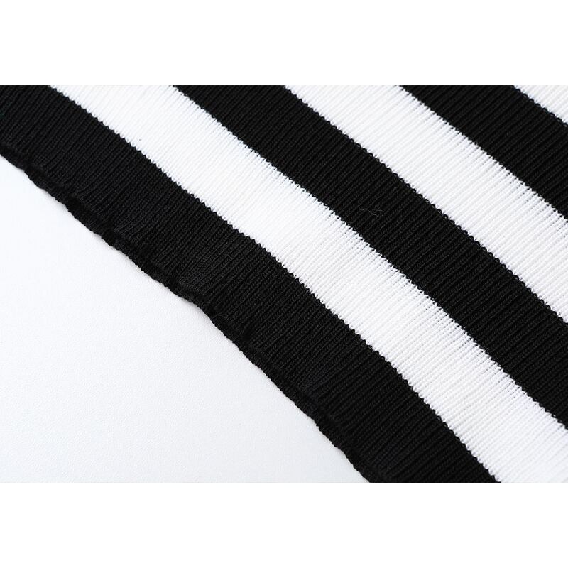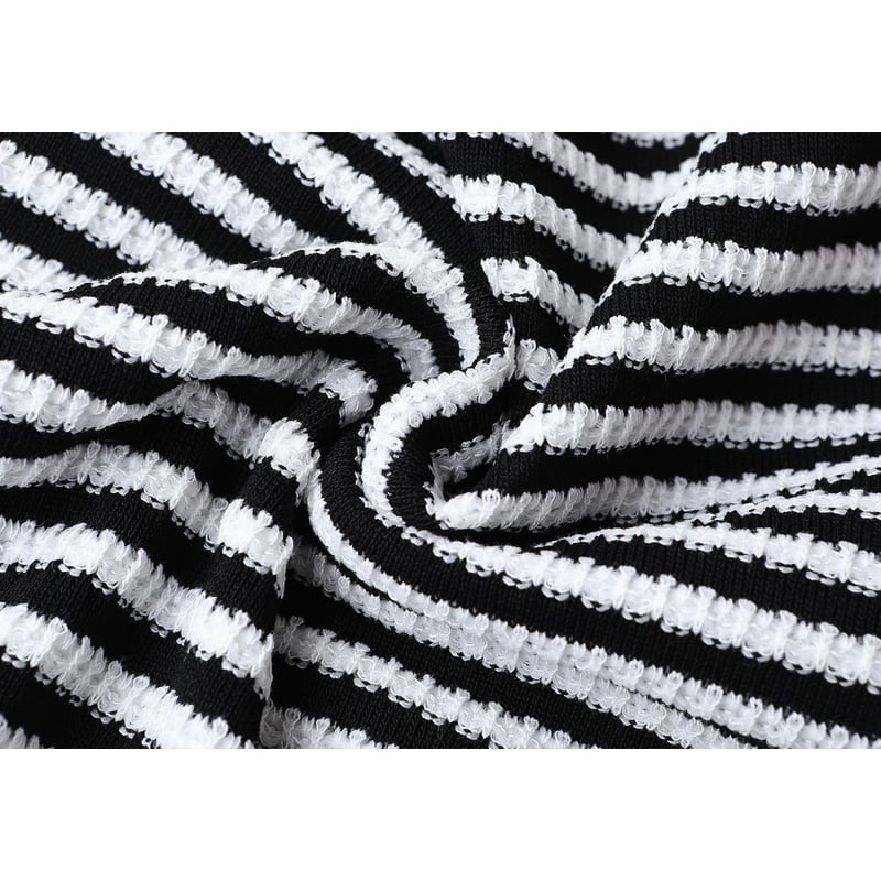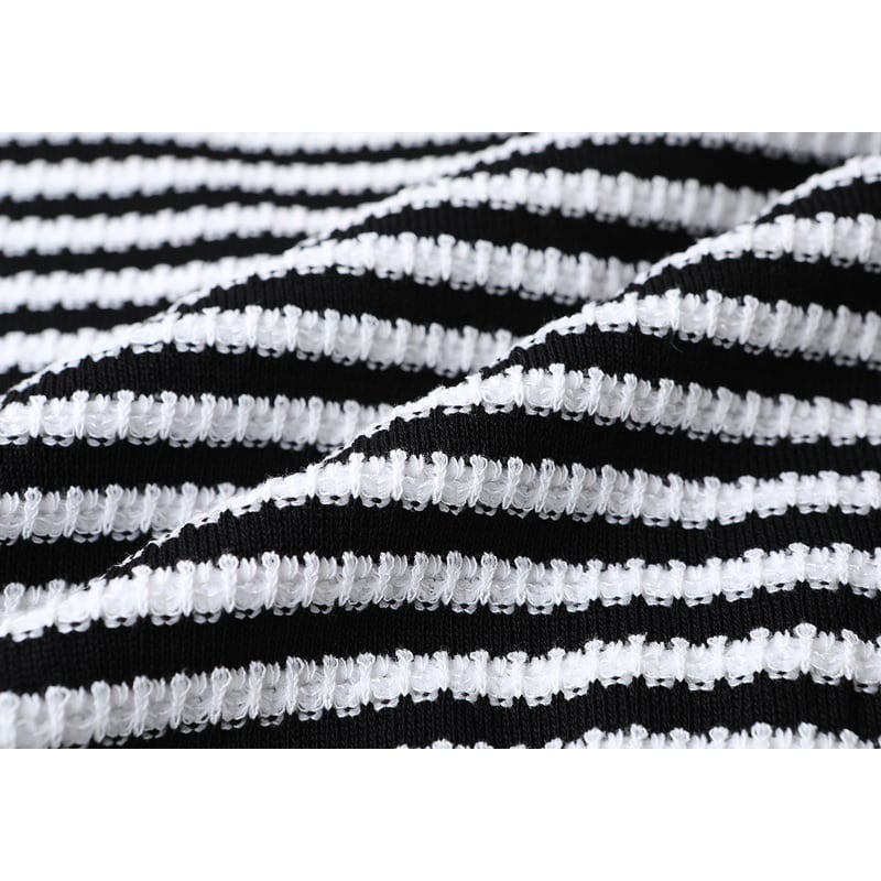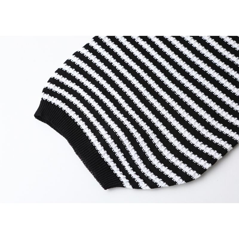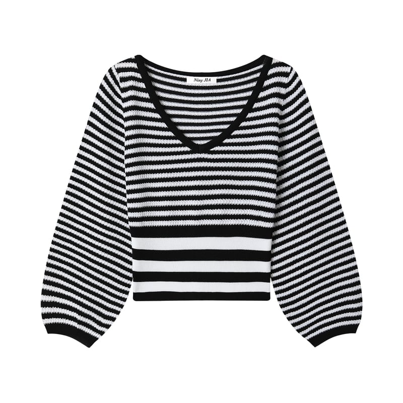 モノトーンのストライプ柄が目を引くニットトップス。短めの丈感で、スタイルアップ効果も期待できます。Vネックのデザインが、デコルテを美しく見せ、女性らしい印象に。普段使いはもちろん、ちょっとしたお出かけにもおすすめです。