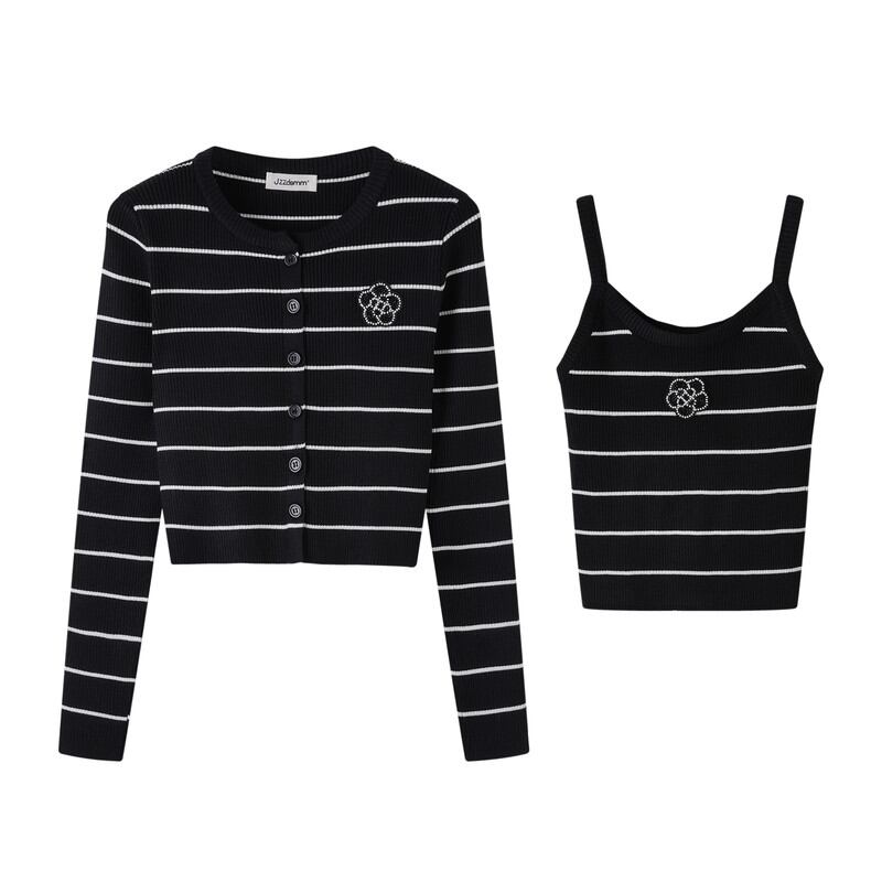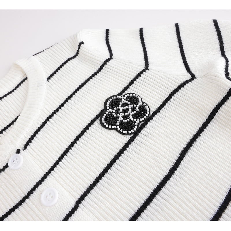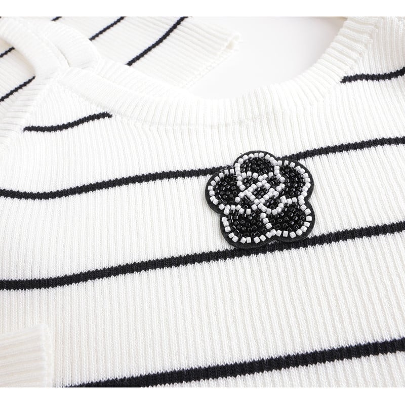 さりげない花モチーフがアクセントになった、爽やかな印象のボーダーニットセットアップです。
