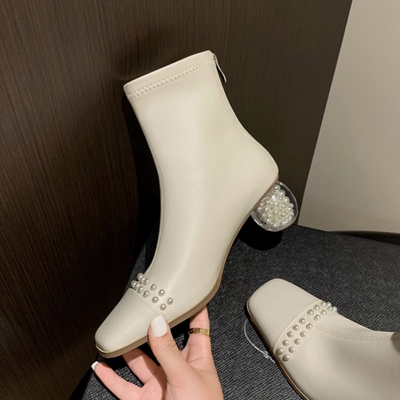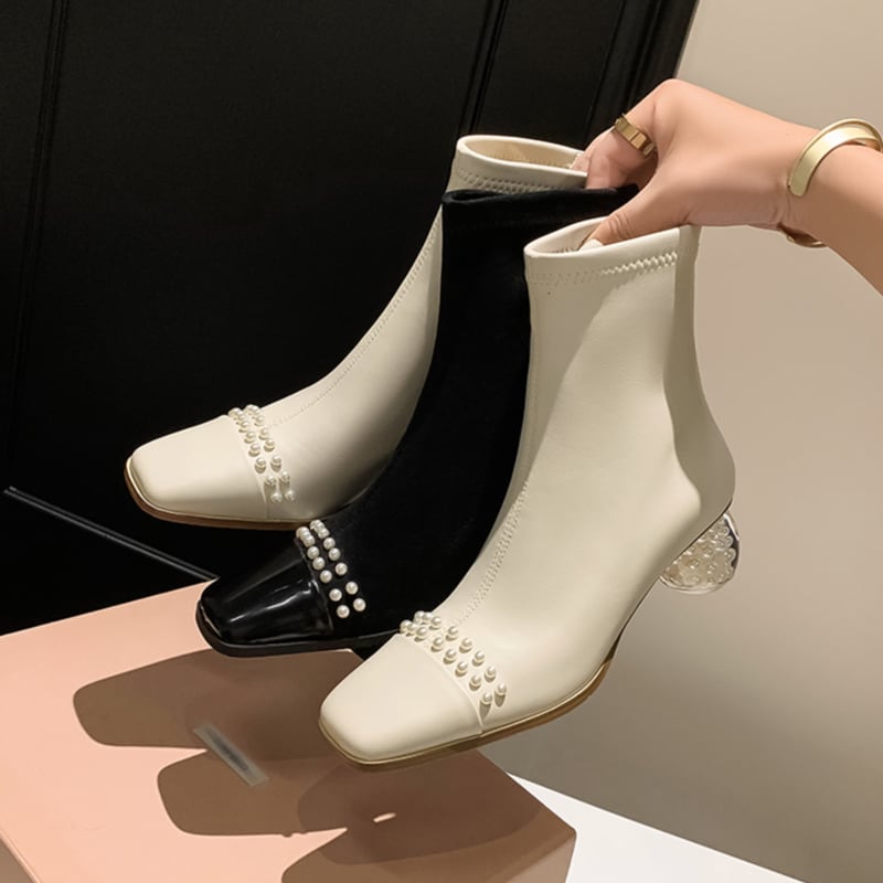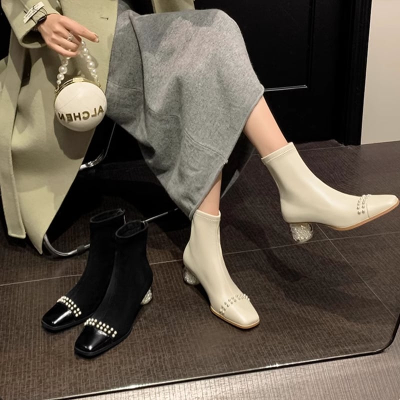 スクエアトゥとミドル丈が、足元を上品に演出するショートブーツ。普段使いはもちろん、パーティーシーンにもおすすめです。クリアヒールの中にあしらわれたパールが、さりげないアクセントをプラスし、後ろ姿まで抜かりなくおしゃれに。 【サイズ】 35(22-22.5cm) 36(22.5-23cm) 37(23-23.5cm) 38(23.5-24cm) 39(24-24.5cm) 40(24.5-25cm) ヒール/5cm 【カラー】 ・ブラック ・ホワイト *Mille Msで人気のアイテムはこちら♪ https://www.millems-fashion.shop/categories/2981297 *新商品入荷中!/SALE情報をcheck https://www.millems-fashion.shop/ **ご購入前に必ずお読みください** https://www.millems-fashion.shop/blog/2020/10/28/193337 【お届けについて】 こちらの商品は海外店舗より直接発送となる為、 ご入金から10日〜3週間前後で発送致します。 ◆注意事項 ・タイミングによっては 商品在庫切れにより 注文キャンセルとさせていただく恐れもございますので、予めご了承くださいませ。 ・こちらは輸入品となります。日本製とは検品基準が異なる為、 新品未使用品でもごくわずかな汚れや ほつれがある場合もございます。 ・仕入れ工場を変えることがあるため、記載サイズと若干異なる場合がございます。 ・商品の色味は、お手持ちのスマートフォンの画面によって実物と若干異なる場合がございます。 ・イメージ違いやサイズ交換等、お客さまご都合による交換、返品は対応出来かねます。 【お支払方法】 ・クレジットカード決済 (VISA/Master/JCB/AMERICAN EXPRESS) ・キャリア決済 (docomo/au/SoftBank/Y!mobile/UQmobile) ・後払い決済 ーーーーーーーーーーーーーーーーーーーー *Mille Ms Instagram https://www.instagram.com/millems_official