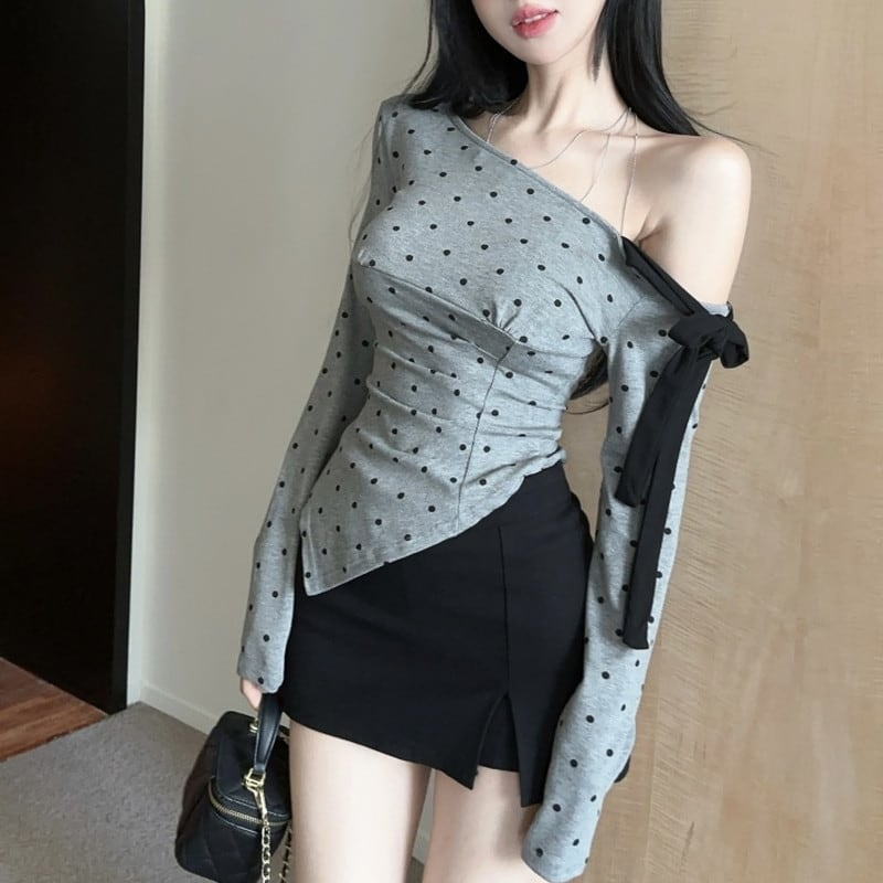 ワンショルダーのラインがすっきり映えるドット柄トップスです。