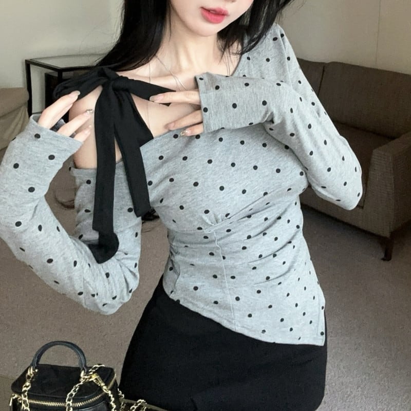 one-shoulder dot ribbon asymmetry cutsew m1155