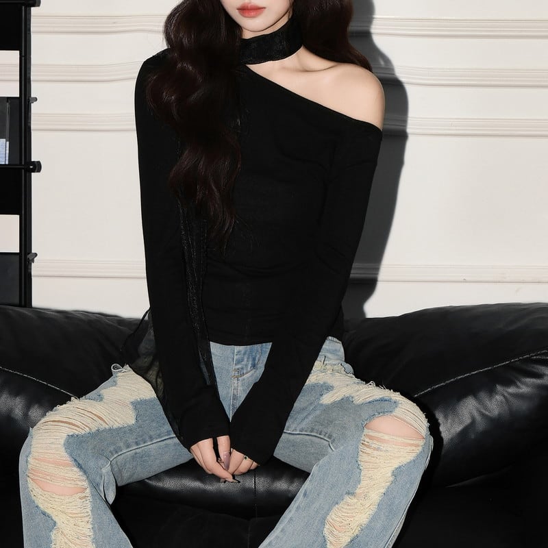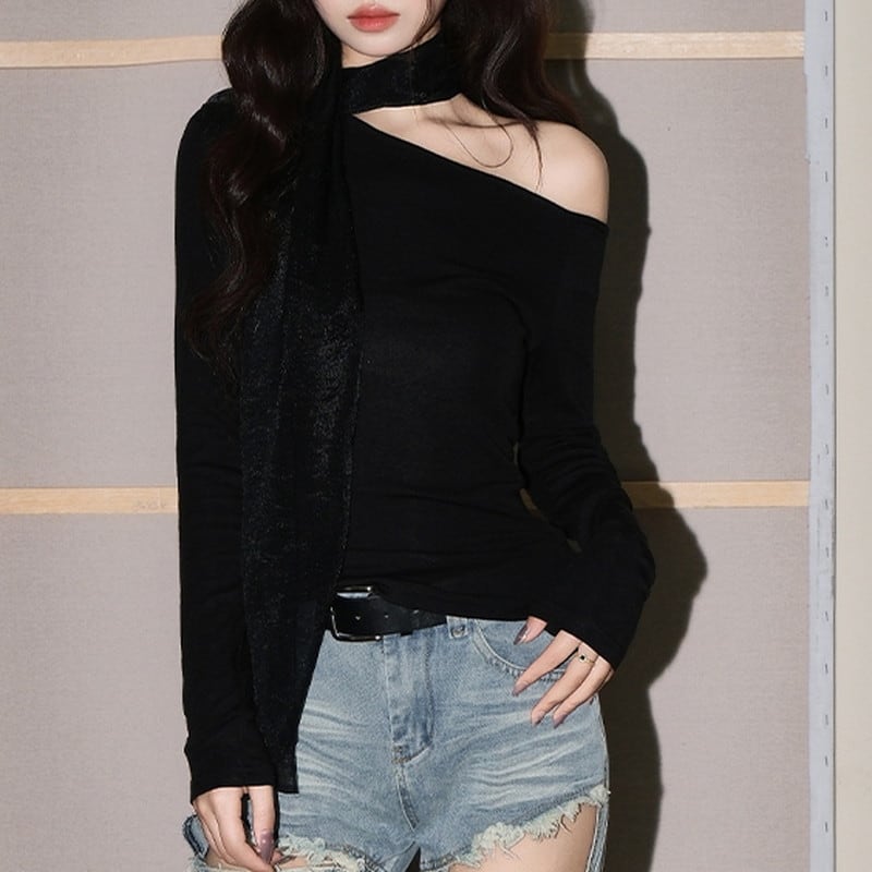 片側に寄せたネックラインがデコルテを美しく見せ、細見えバランスを引き立てるデザイン。