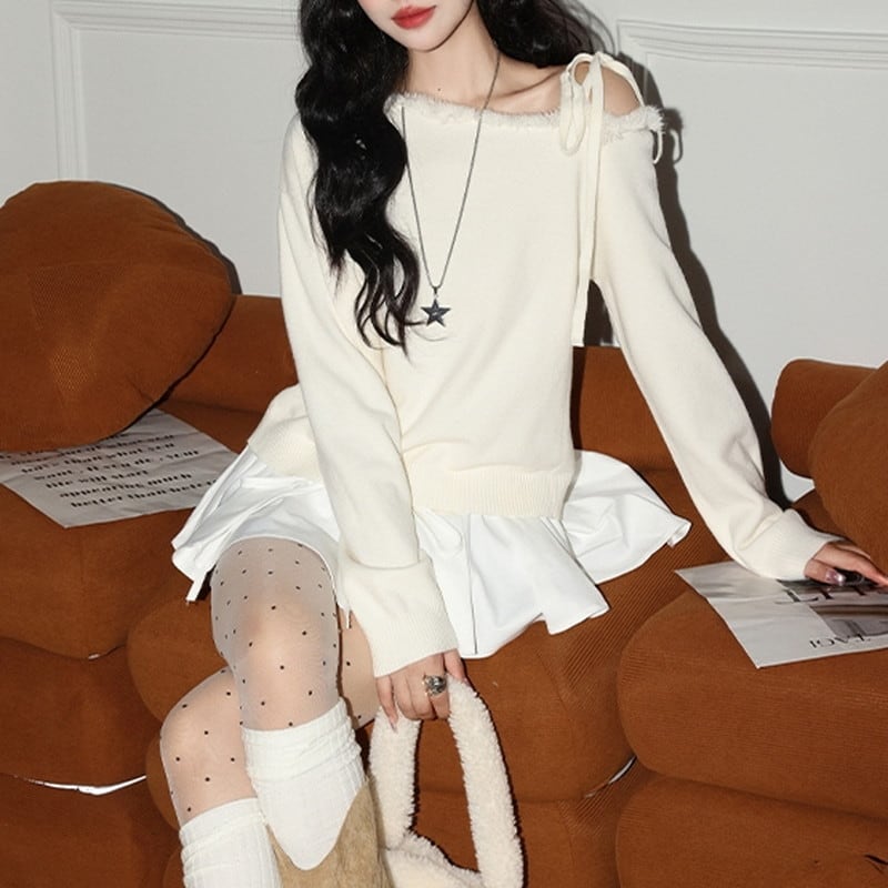 片側の肩を見せるデザインが柔らかな抜け感を生み、控えめなリボンが可愛らしいワンポイント。