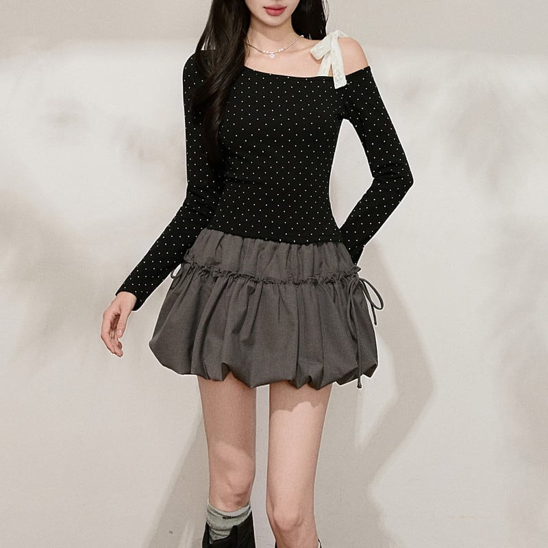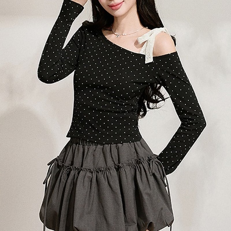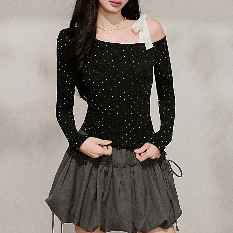 片側の肩を見せるデザインが抜け感をつくり、控えめなドット柄が上品な印象。