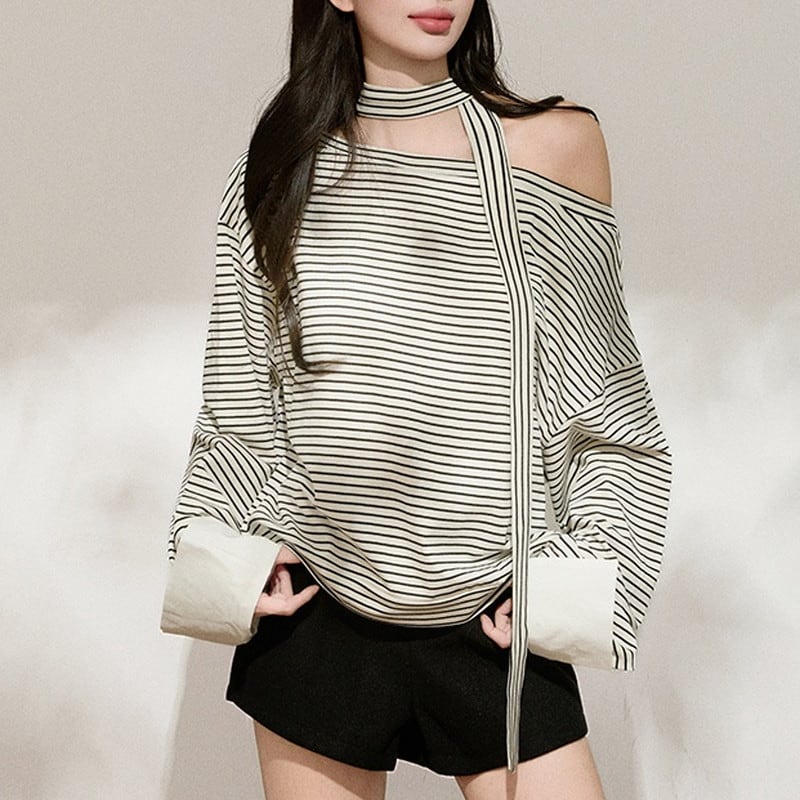 抜け感のあるストライプタイオフショルトップスです。