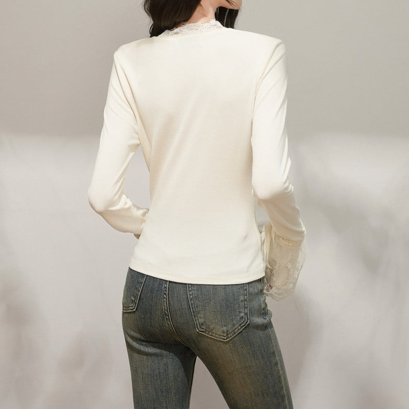 袖口が広がるシルエットは動くたびにニュアンスが加わり、首元のレースが上品さをそっと添えます。