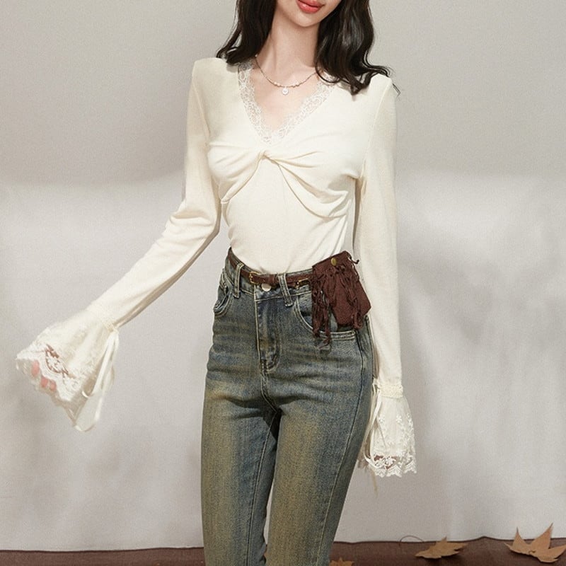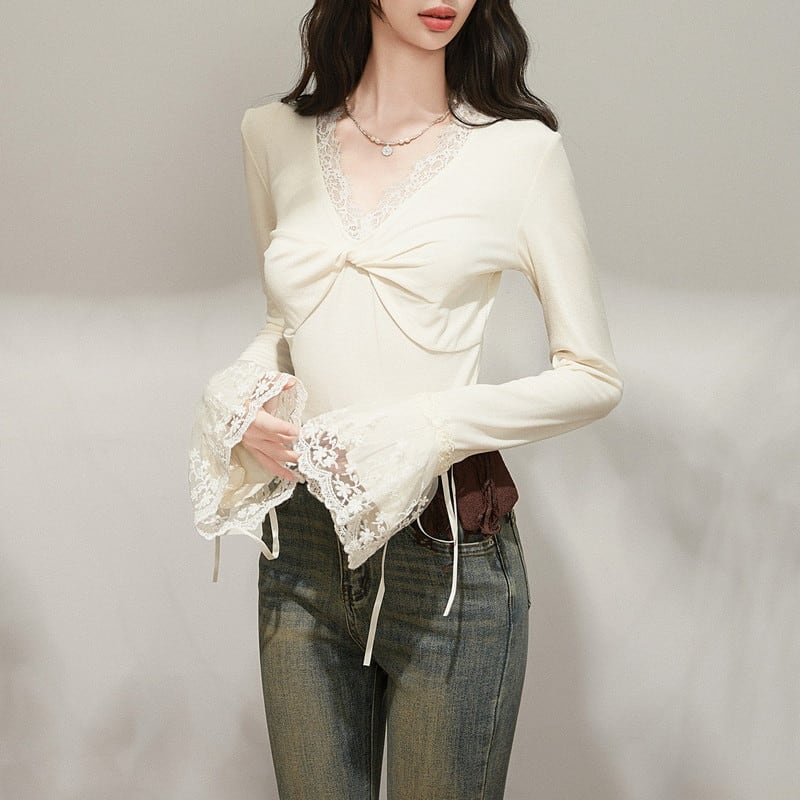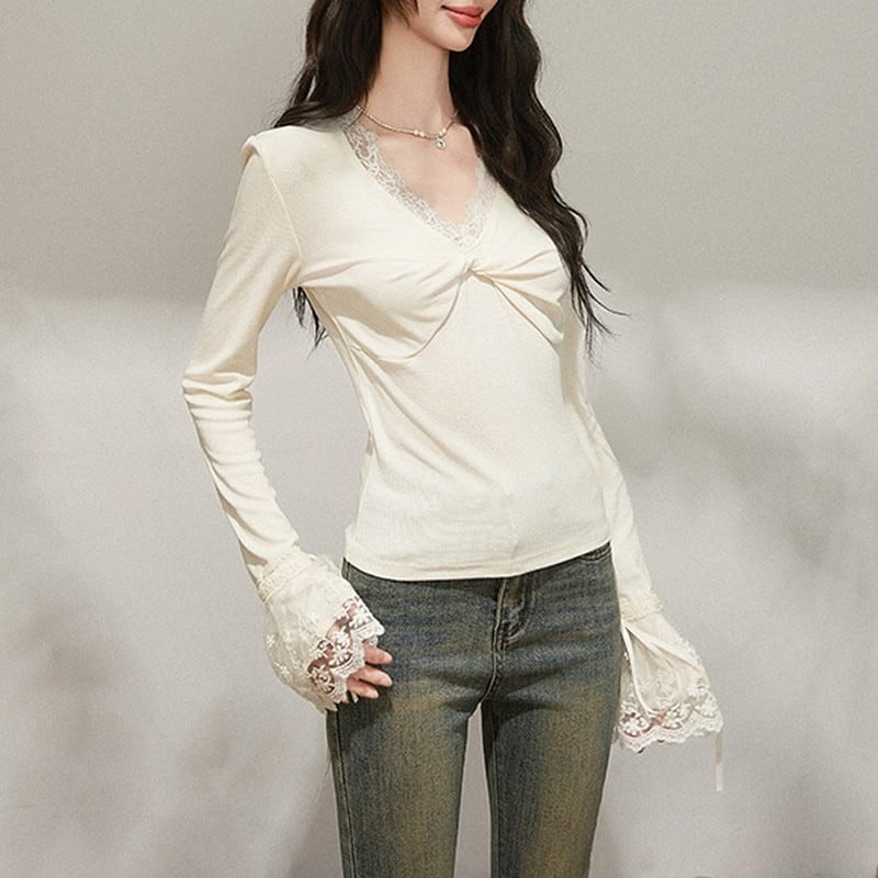 胸元のツイストが立体感をつくり、レースの重なりがほんのりフェミニンな印象。