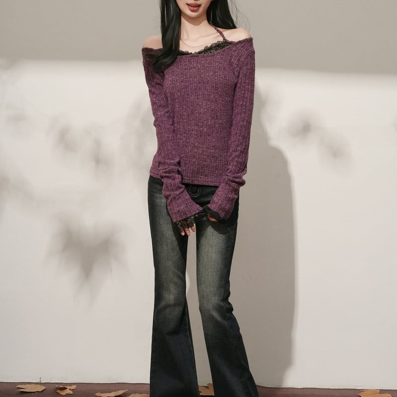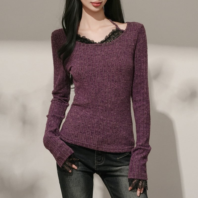 レースがのぞく袖口が印象的なリブニットトップスです。
