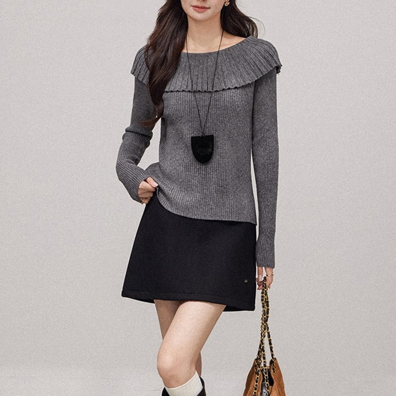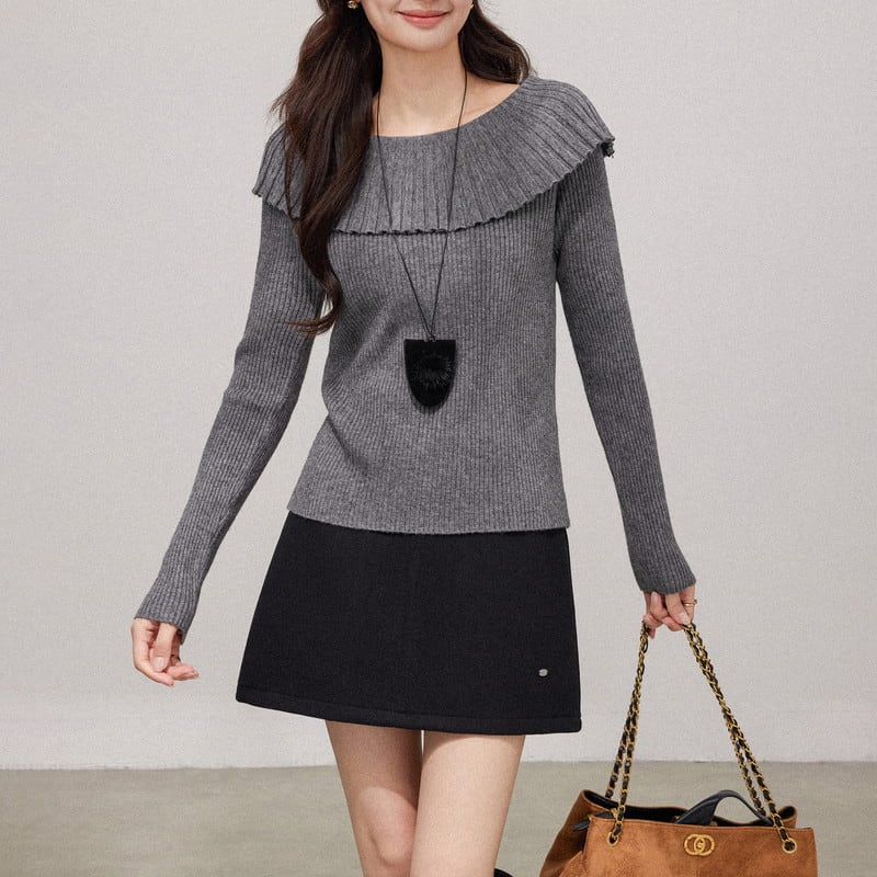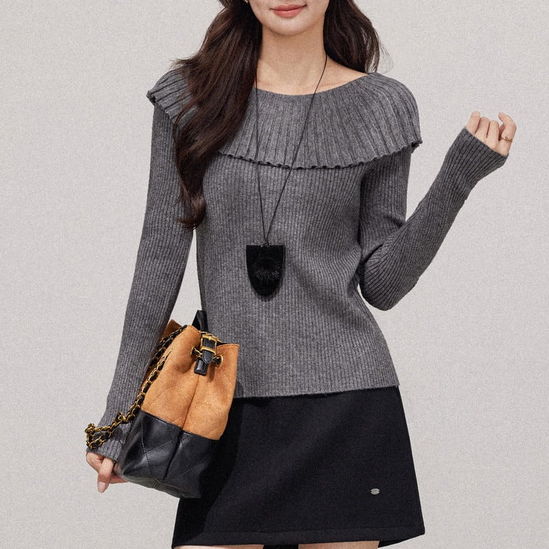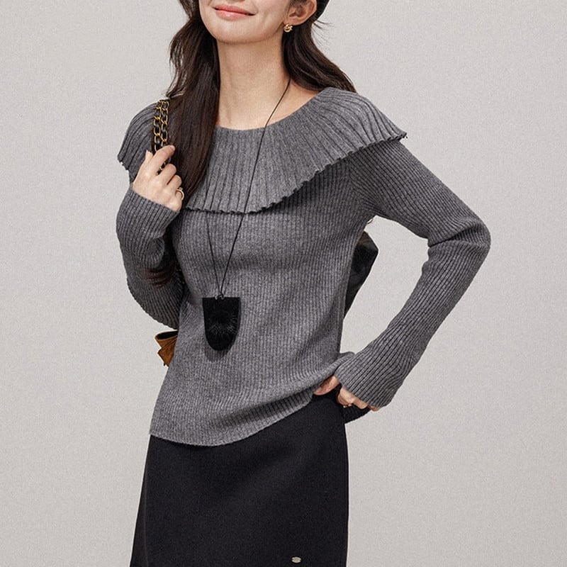 ボートネック風の開きが顔まわりをすっきり見せ、甘さと大人っぽさがちょうどよく共存します。