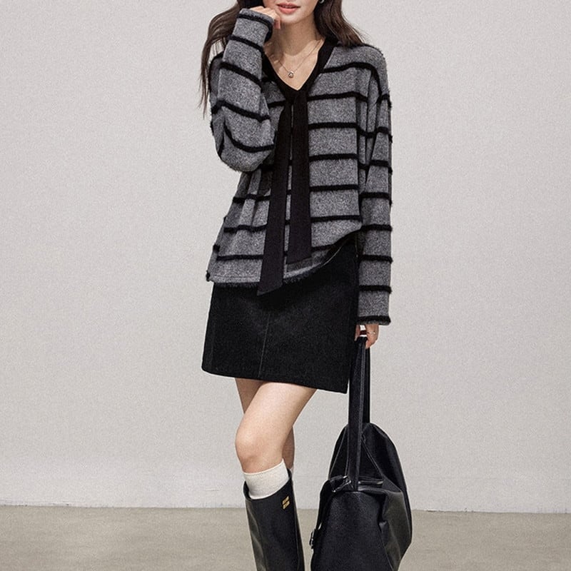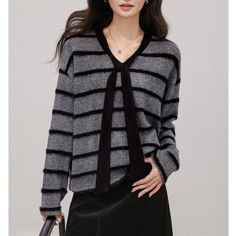 ゆるく揺れるボウタイがアクセントになるボーダーニットです。